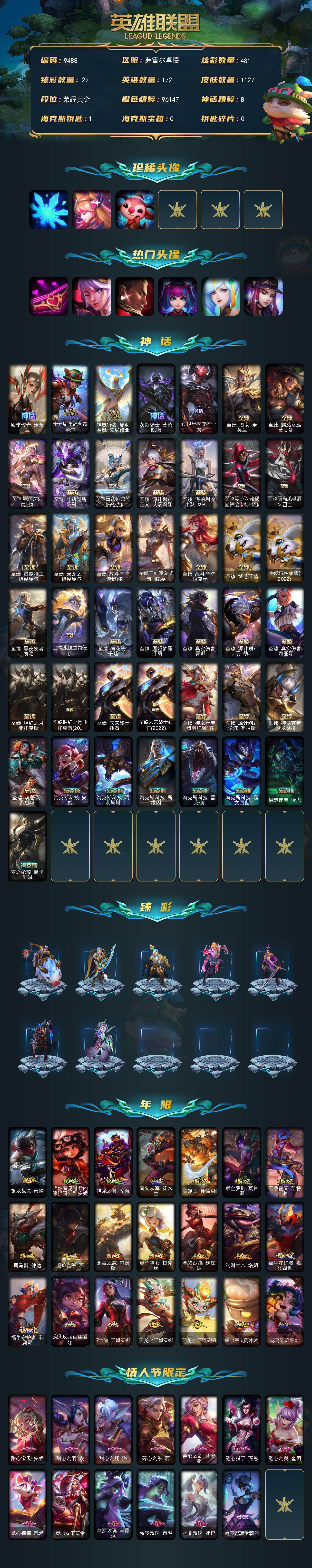 【皇冠号 牛角】黄金段位-172英雄-1127皮肤-481炫彩-4终极-43神话-182限定-96传说-207史诗