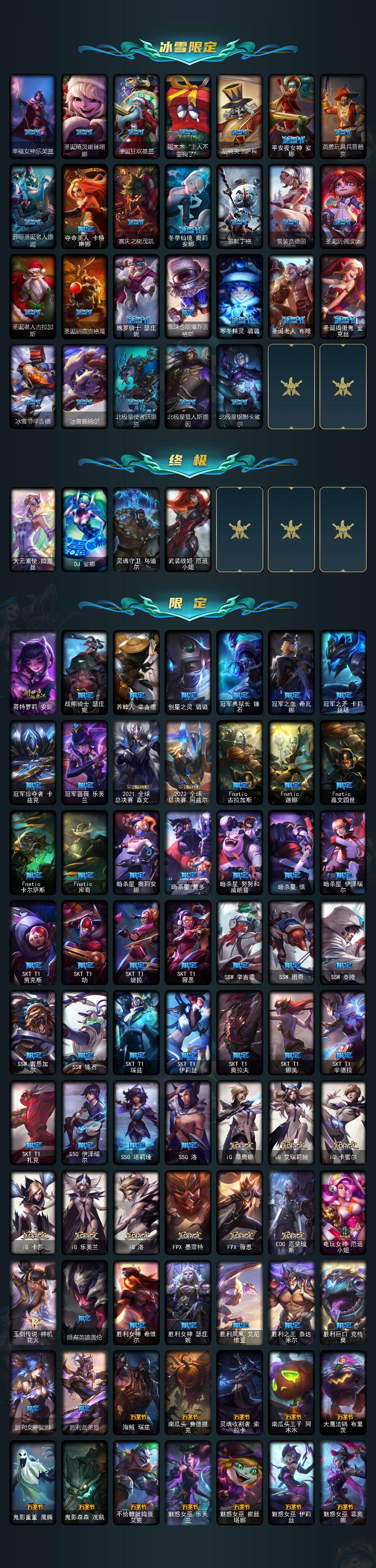 【至臻皮肤】:至臻魔女乐芙兰,至臻魅惑女巫莫甘娜,至臻蒙面女郎莫甘娜,至臻斗魂觉醒萨科,至臻玉剑传说