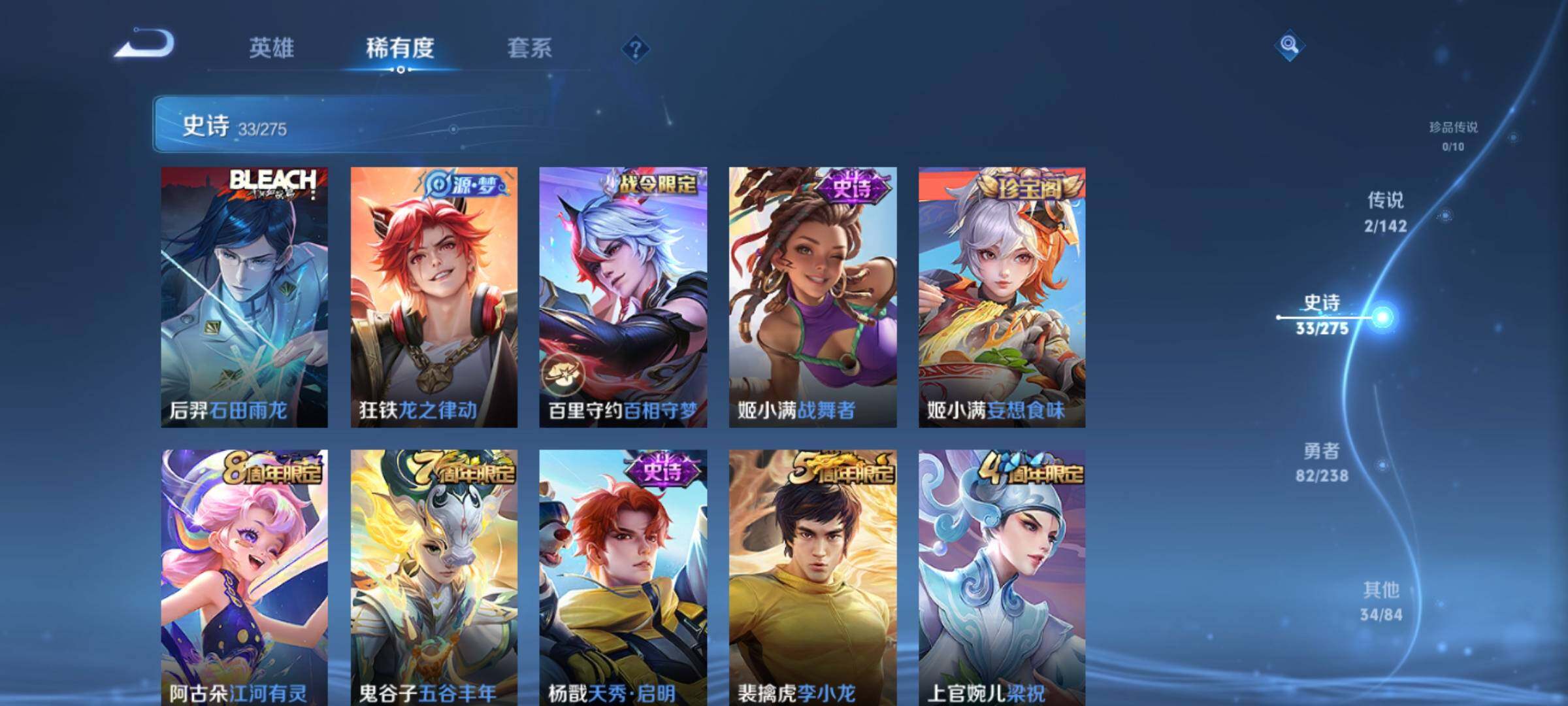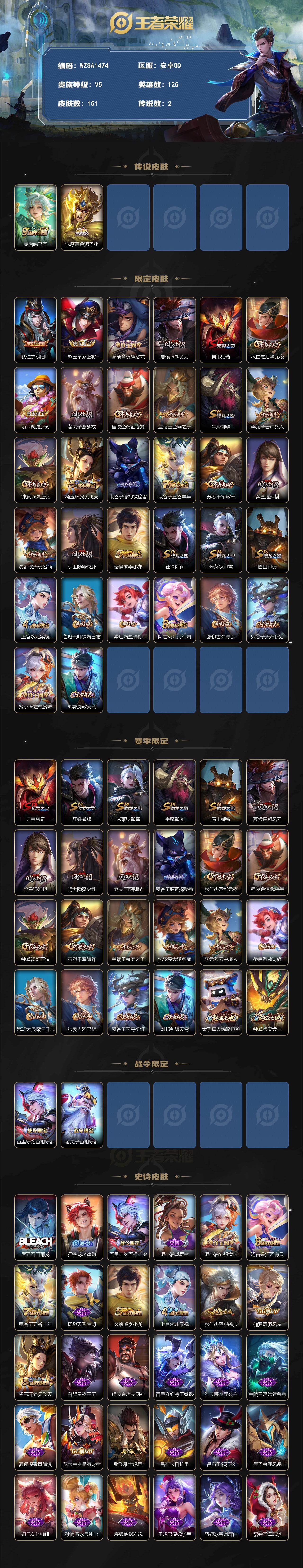 贵族5/皮肤151/传说2/史诗33/英雄125/桑启-鸣野