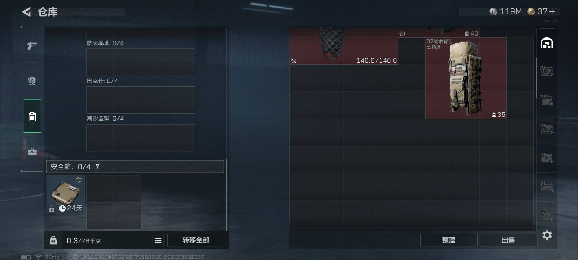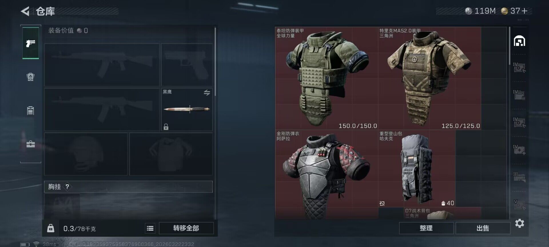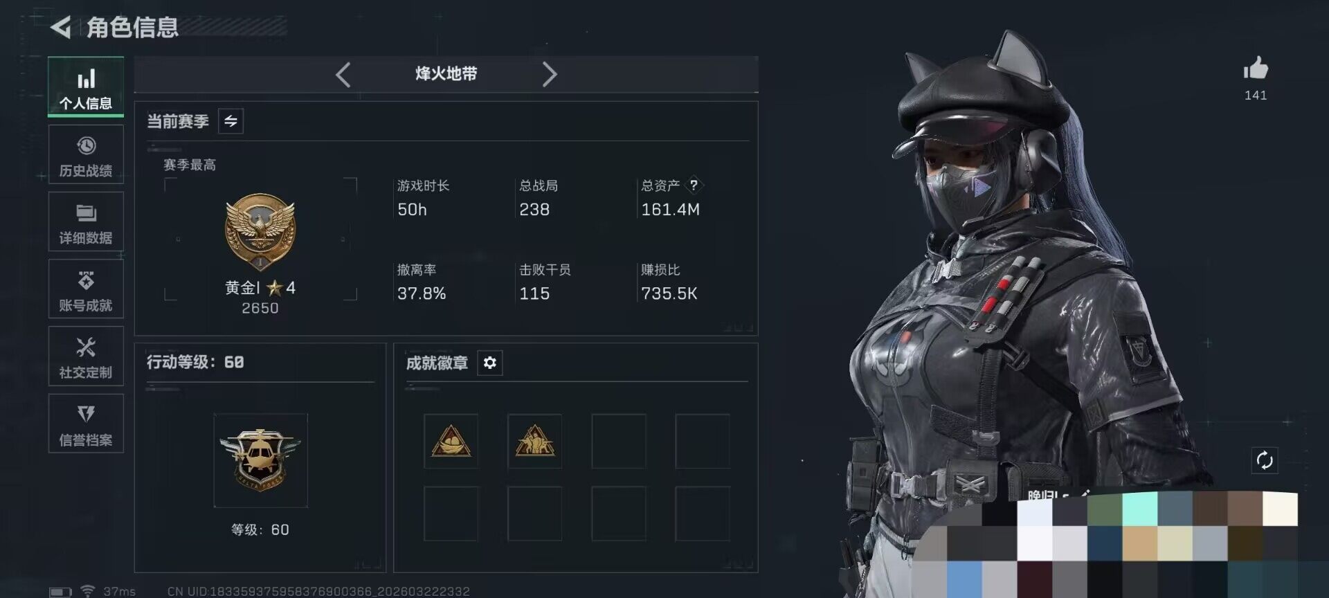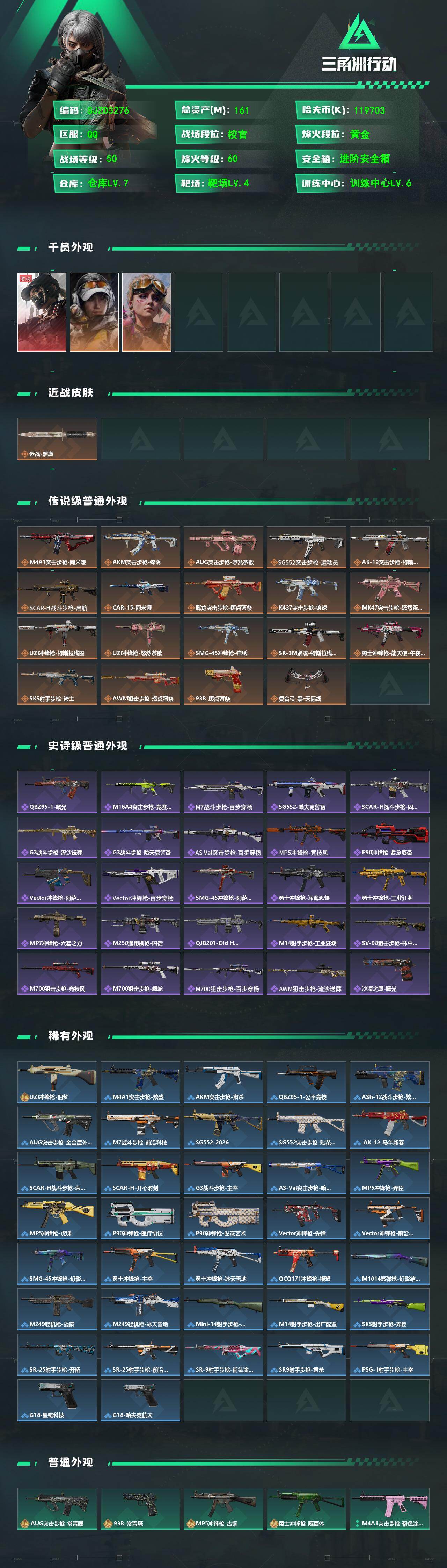 总资产(M):161M/哈夫币(K):119703K/传说枪皮数:19/全面战场等级:50_段位:校官/烽火地带等级:60_段位:黄金/
