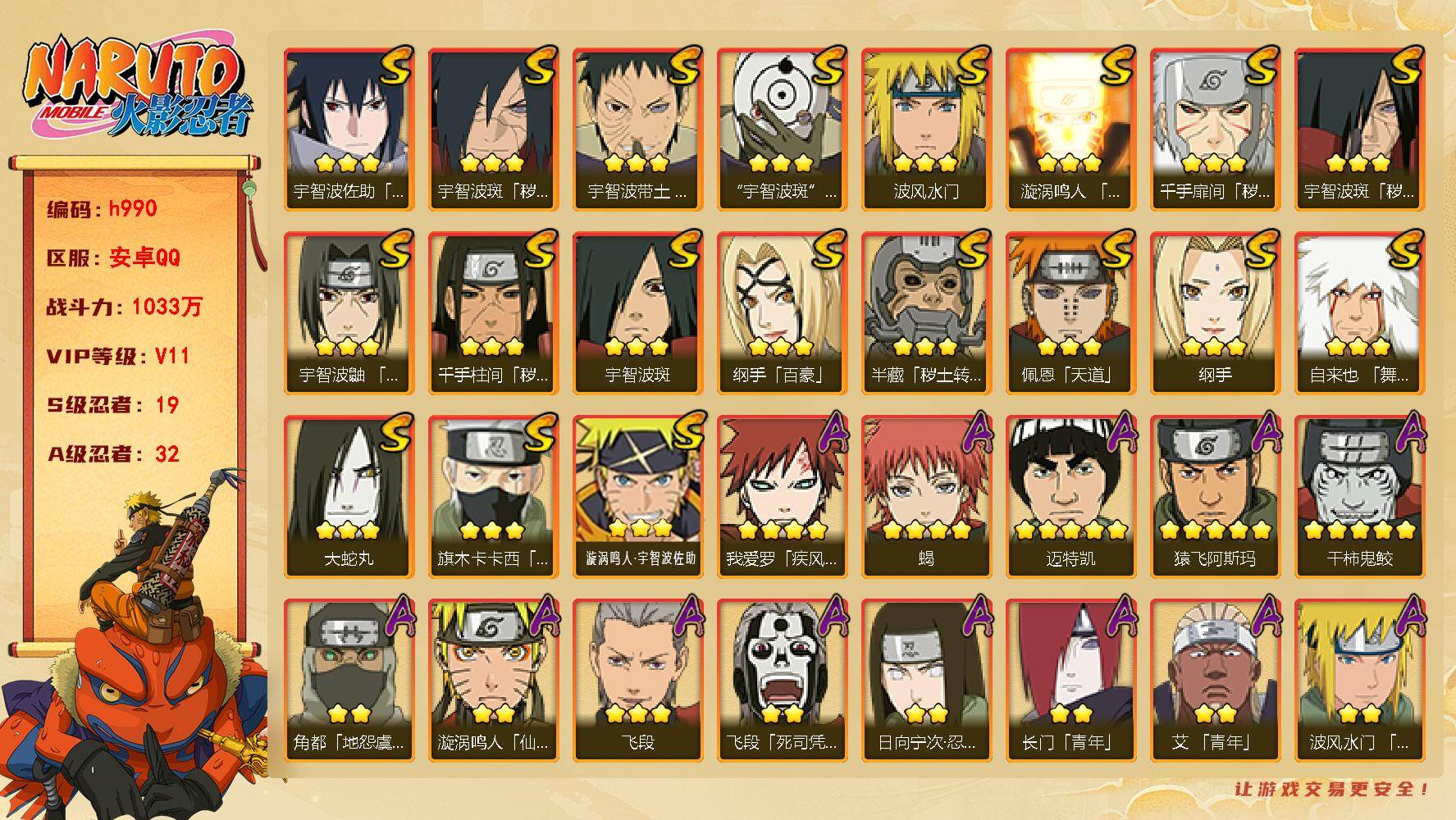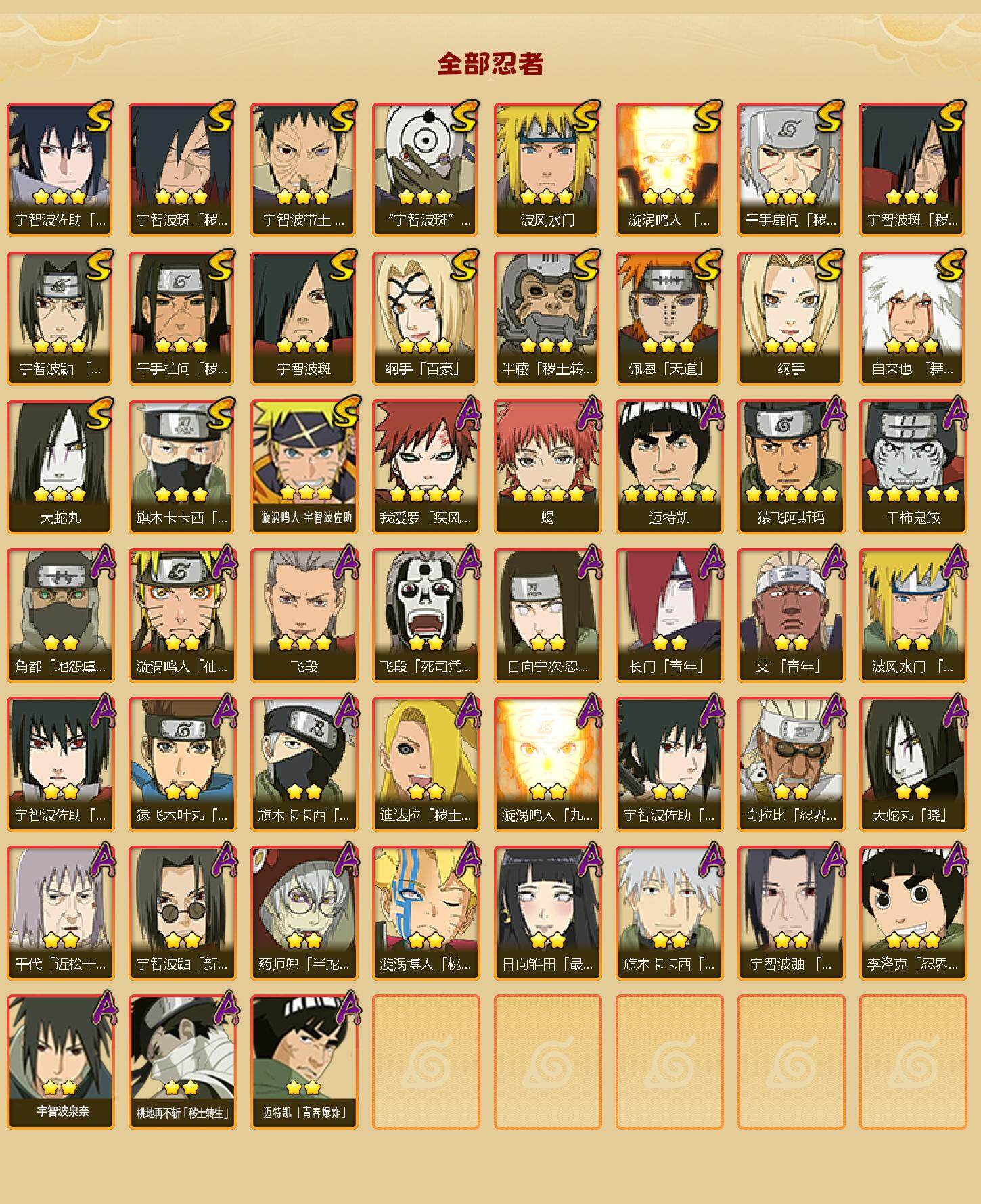19S级忍者数-32A级忍者数【S级忍者】:半藏「秽土转生」(3星),千手扉间「秽土转生」(3星),千手柱间「秽土转生」(3星),宇智波斑「秽土转生」(3星),宇智波斑「秽土转生·解」(3星),宇智波带土「忍界大战」(3星),宇智波鼬「须佐能乎」(3星),旗木卡卡西「须佐能乎」(3星),自来也「舞之豪杰」(3星),大蛇丸(3星),纲手(3星),纲手「百豪」(3星),宇智波斑(3星),波风水门(3星),漩涡鸣人「九喇嘛连结」(3星),佩恩「天道」(3星),宇智波佐助「永恒万花筒」(3星),宇智波斑