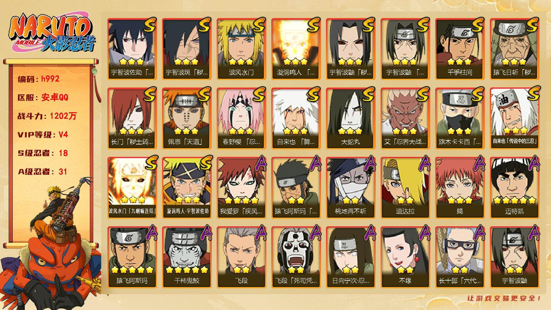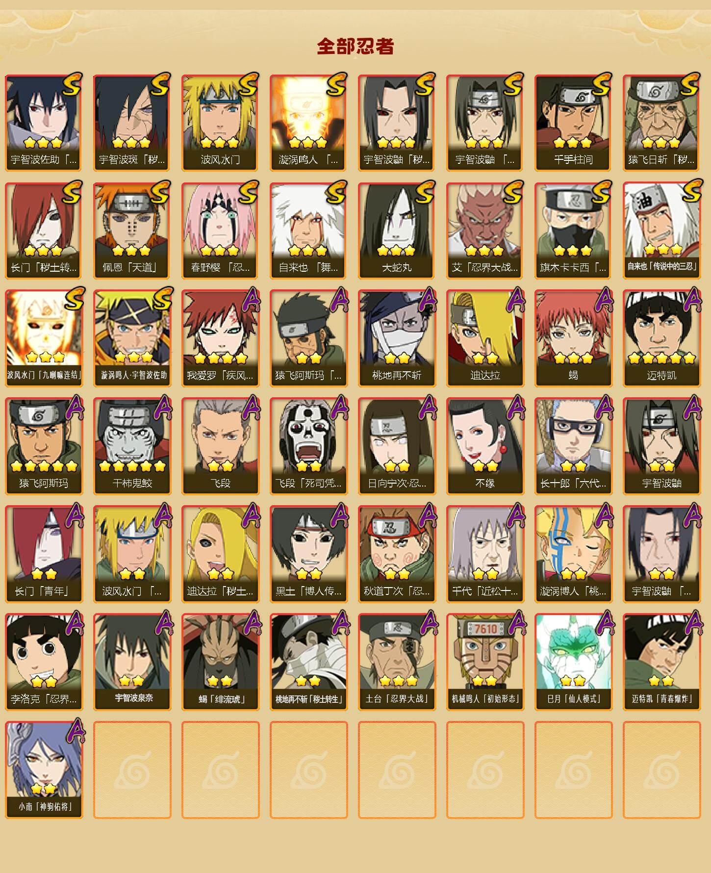 18S级忍者数-31A级忍者数【S级忍者】:长门「秽土转生」(3星),猿飞日斩「秽土转生」(3星),宇智波鼬「秽土转生」(3星),宇智波斑「秽土转生·解」(3星),春野樱「忍界大战」(3星),艾「忍界大战」(3星),宇智波鼬「须佐能乎」(3星),旗木卡卡西「须佐能乎」(3星),自来也「舞之豪杰」(3星),大蛇丸(3星),自来也「传说中的三忍」(3星),千手柱间(3星),波风水门(3星),漩涡鸣人「九喇嘛连结」(3星),佩恩「天道」(3星),宇智波佐助「永恒万花筒」(3星),波风水门「九喇嘛连结」