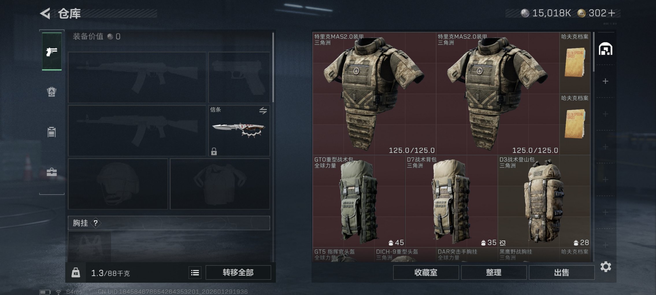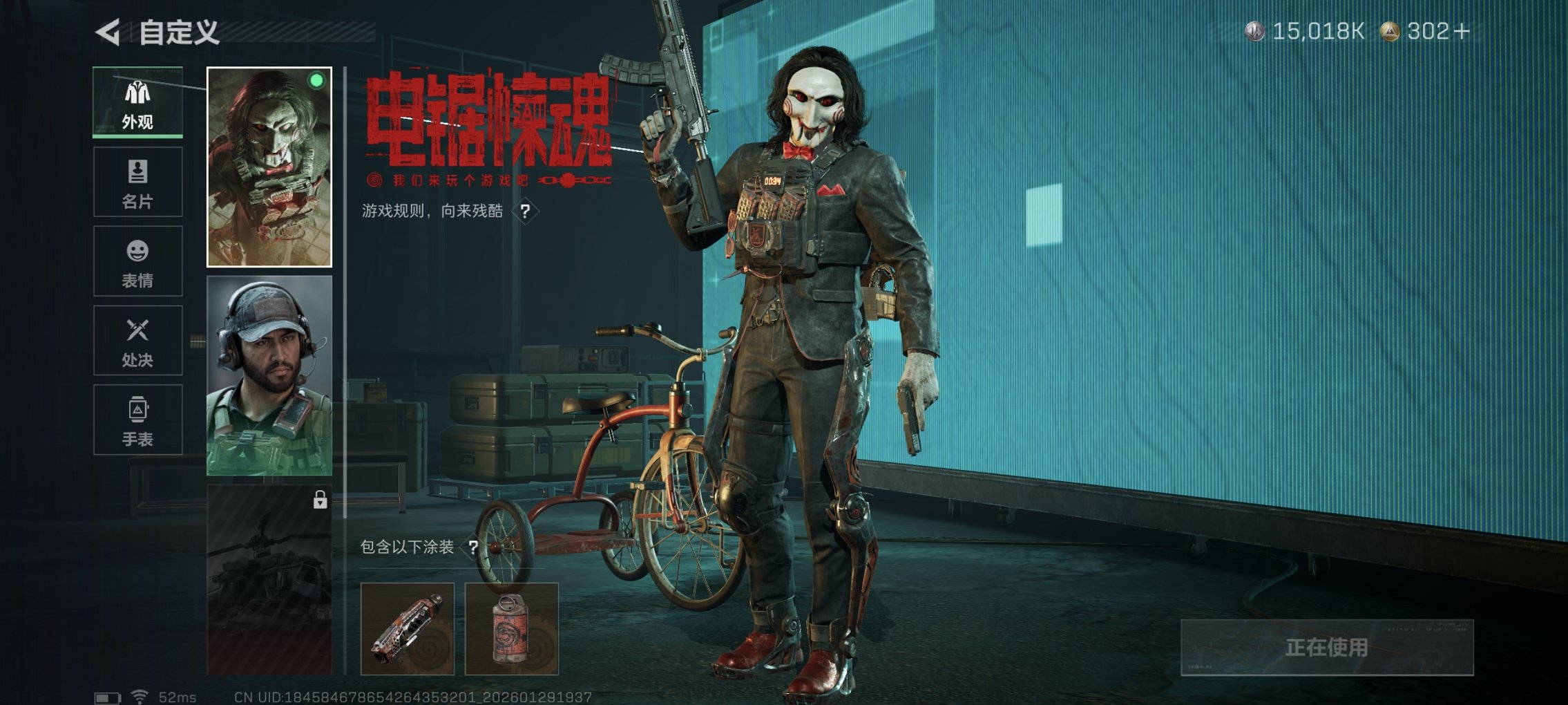 【信条 红皮女医】总资产133M,哈夫币15,018K,行动等级:60,近战数量:1,干员红皮数量:1,仓库等级:10级,训练中心等级:7级,靶场等级:7级,干员皮肤:3,枪皮:119
