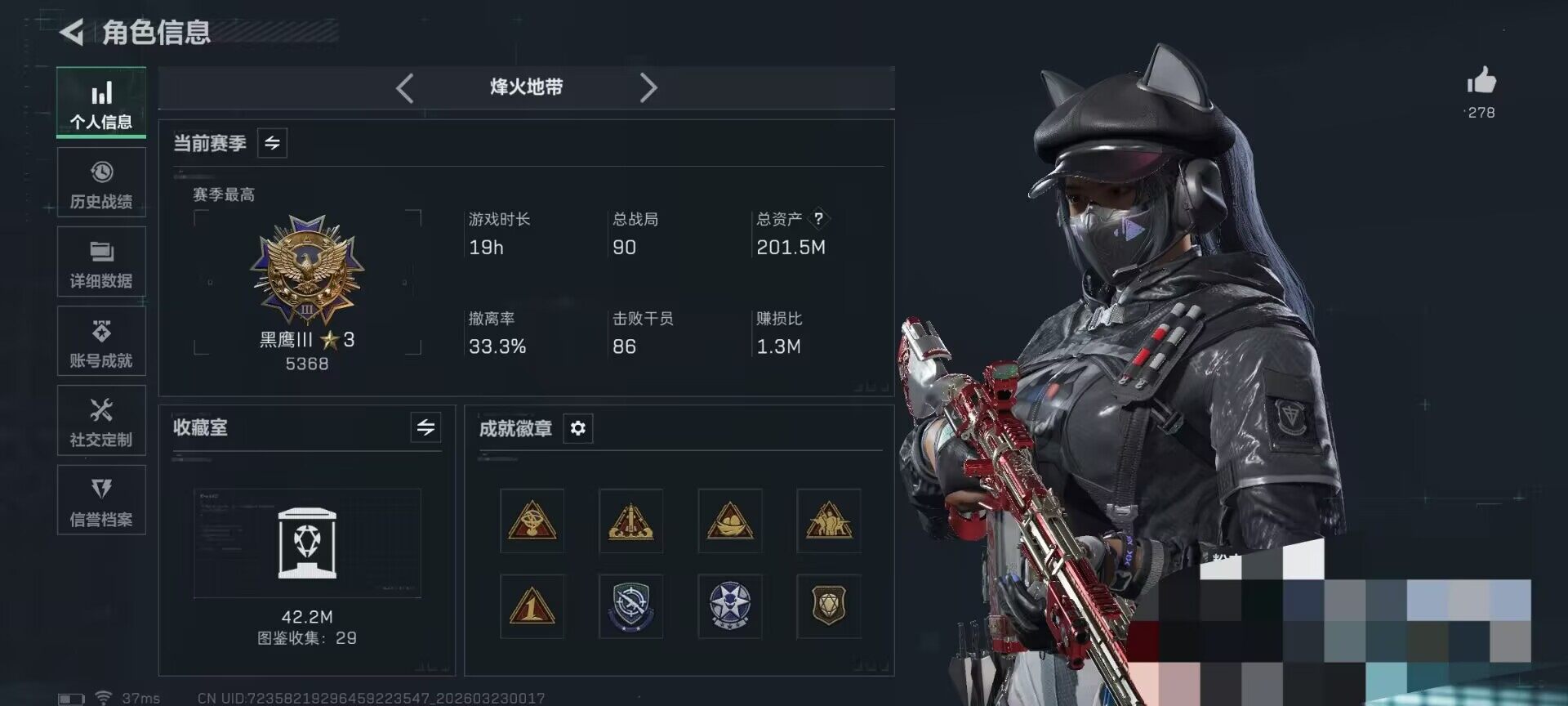 总资产(M):201M/哈夫币(K):13847K/传说枪皮数:47/全面战场等级:50_段位:上等兵/烽火地带等级:60_段位:黑鹰/