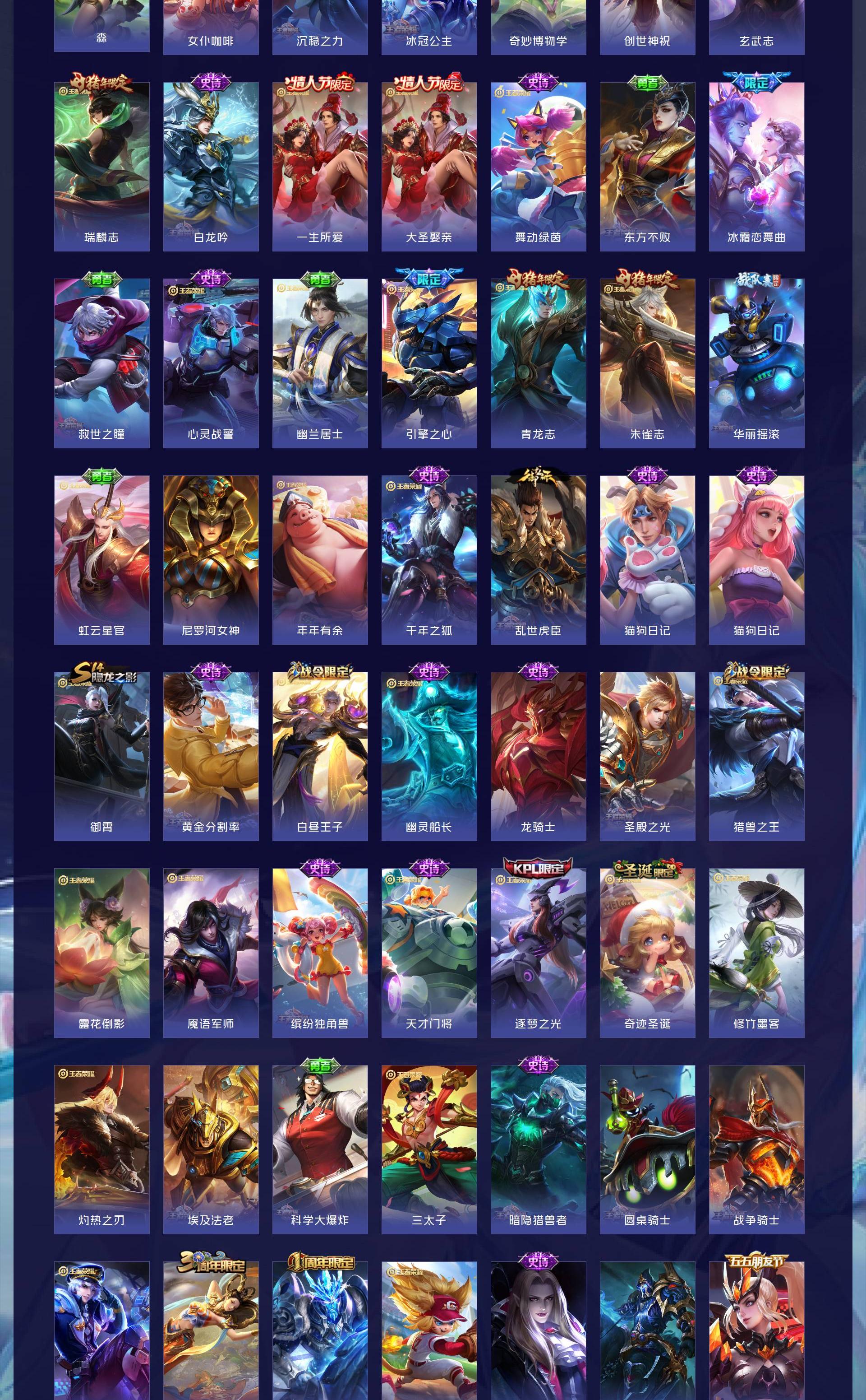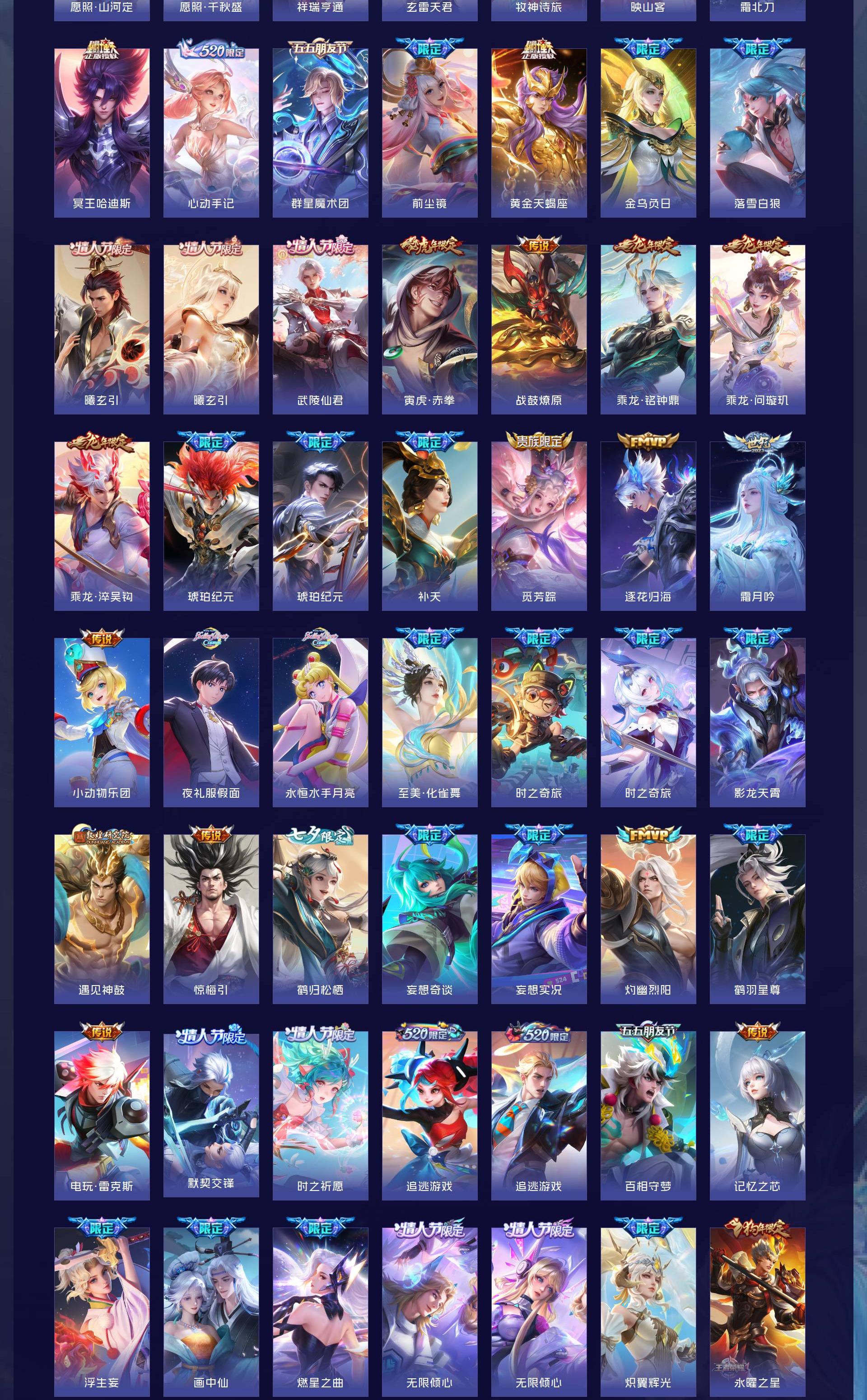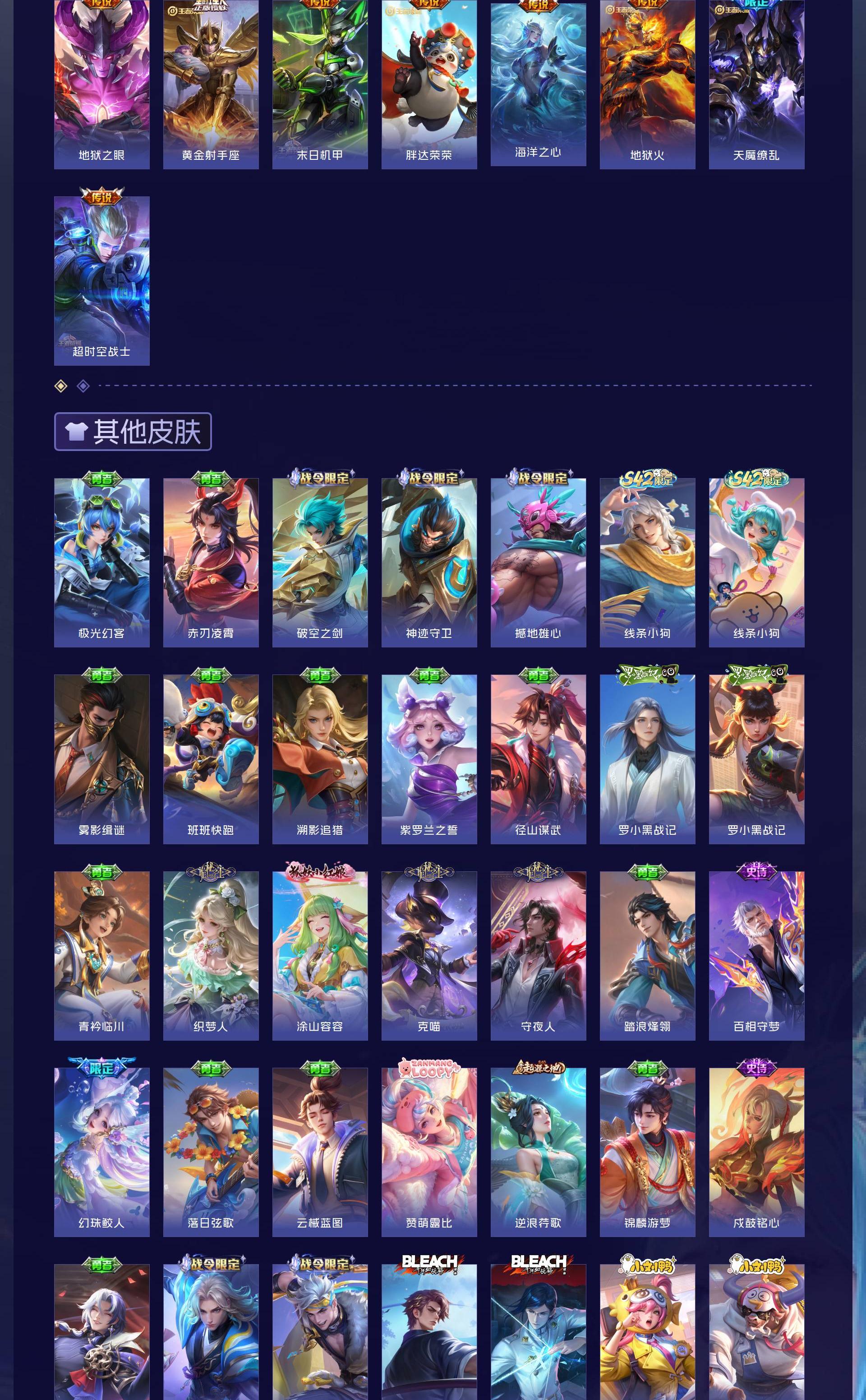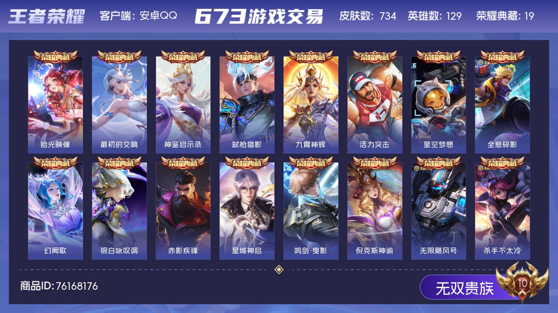 无双贵族 皮肤734 英雄129 尊贵铂金 荣耀典藏19 珍品无双1 无双皮肤11 珍品传说9 星传说22 传说128
