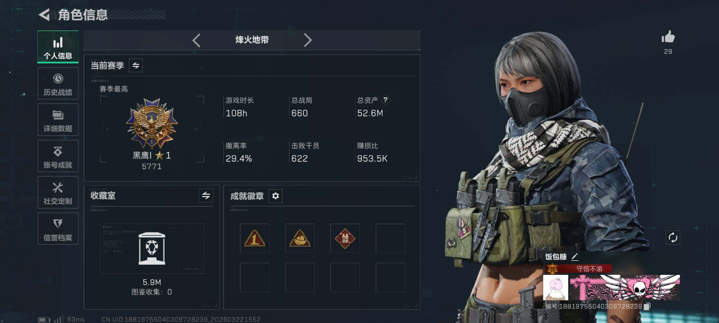 {特价出售}等级:60 总资产:51.9M 纯币1327k 红皮:蚀金玫瑰,水墨云图 刀皮:信条 砖皮: m7棱镜(优品s) 特勤处:仓库7,训练6,靶场6