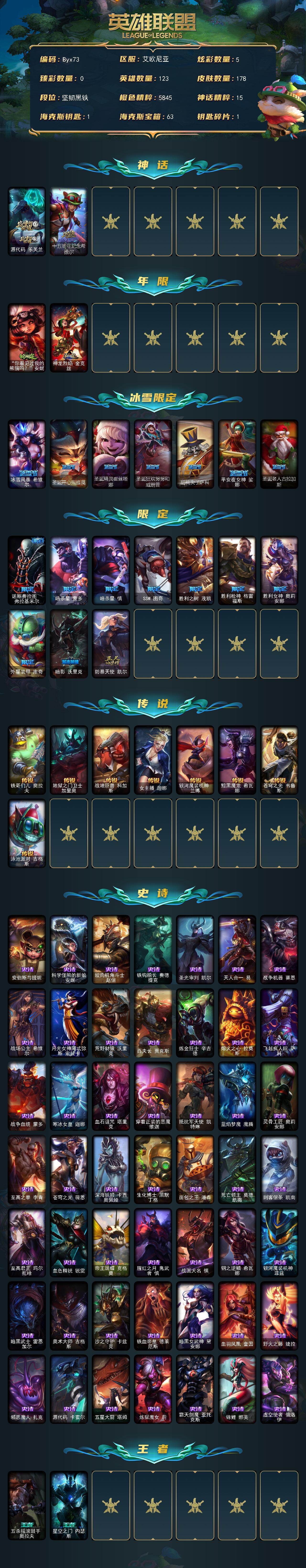 电信大区艾欧尼亚【神话:2 限定:19 传说:8 史诗:49 皮肤:178 炫彩:5 英雄:123】