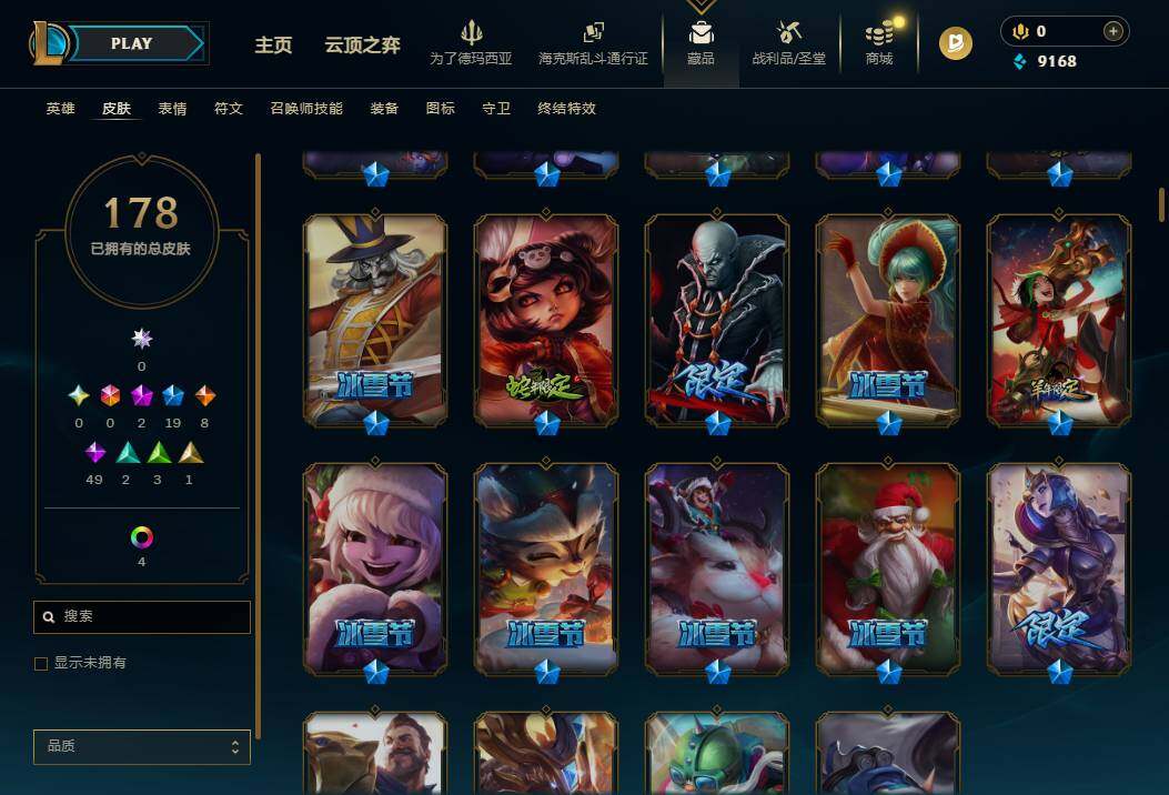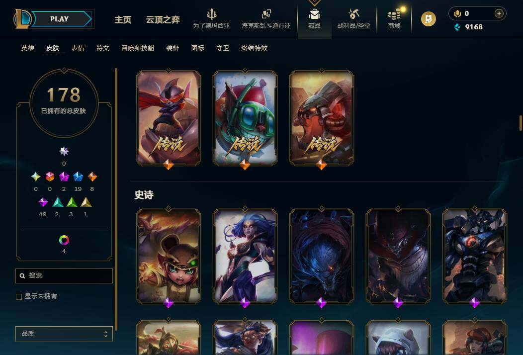 神话:2 限定:19 传说:8 史诗:49 皮肤:178 炫彩:5