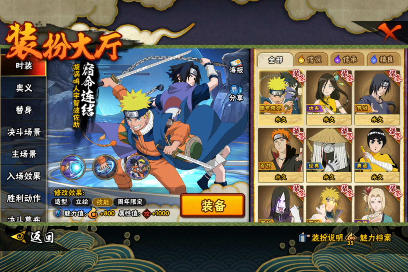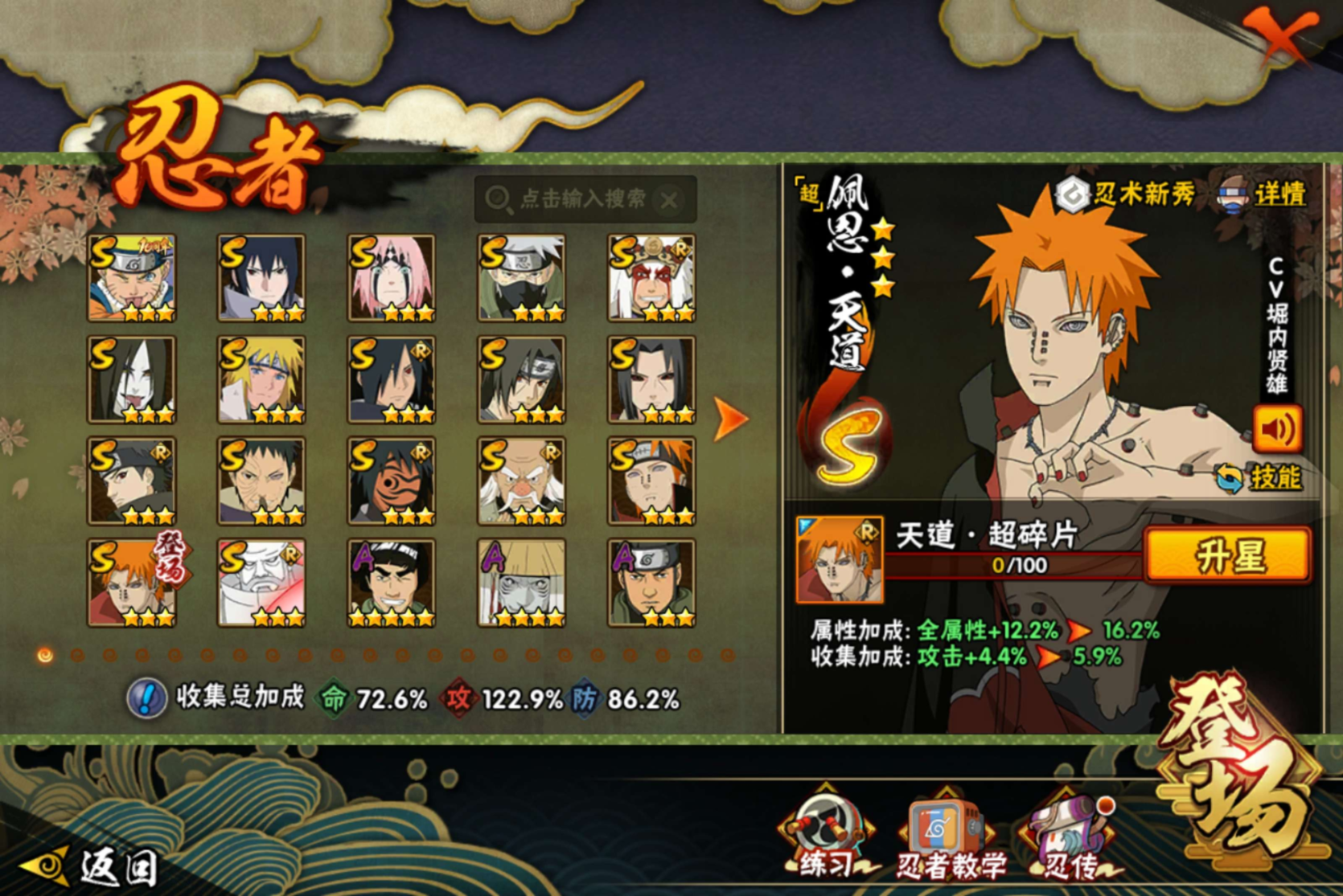 【S级忍者】宇智波带土「忍界大战」(3星),宇智波斑「木叶创立」(3星),大野木「忍界大战」(3星),旗木卡卡西「须佐能乎」(3星),宇智波佐助「永恒万花筒」(3星),神秘面具男「红夜之刃」(3星),大筒木金式(3星),春野樱「忍界大战」(3星),宇智波止水「须佐能乎」(3星),自来也「舞之豪杰」(3星),宇智波鼬「秽