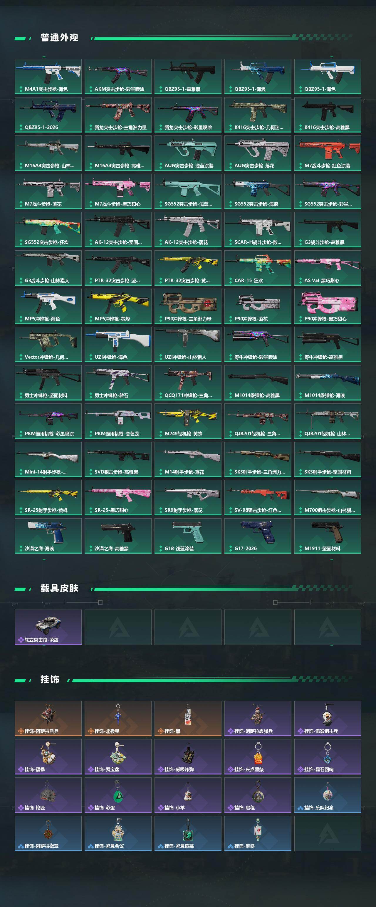 【传说外观】:M4A1突击步枪-阿米娅,AK-12突击步枪-夜鹰,SCAR-H战斗步枪-启航,CAR-15突击步枪-阿米娅,腾龙突击步枪-捞点薯条,K437突击步枪-北极星,勇士冲锋枪-能天使-午夜邮差,QC