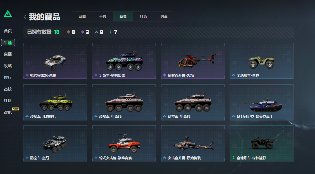 【载具】 防空车-赤色军团 步战车-几何碎片 步战车-生命线 防空车-生命线 全地形车-童趣 轮式突击炮-护林人 M1A4坦克-哈夫克重工 侦察直升机-火焰 M1A4坦克-战痕 全地