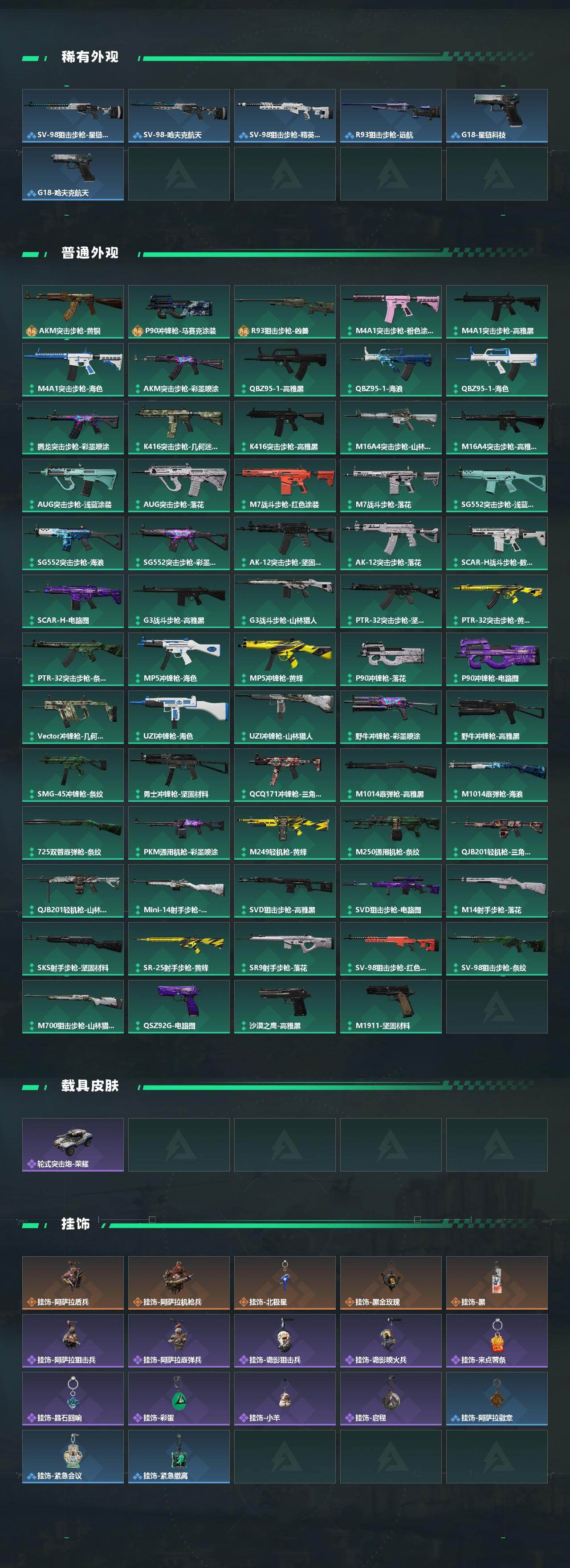 【传说外观】:M4A1突击步枪-蚀金玫瑰,AK-12突击步枪-夜鹰,SCAR-H战斗步枪-启航,G3战斗步枪-骑士,腾龙突击步枪-捞点薯条,K437突击步枪-北极星,勇士冲锋枪-能天使-午夜邮差,QCQ171冲锋枪-北极星,