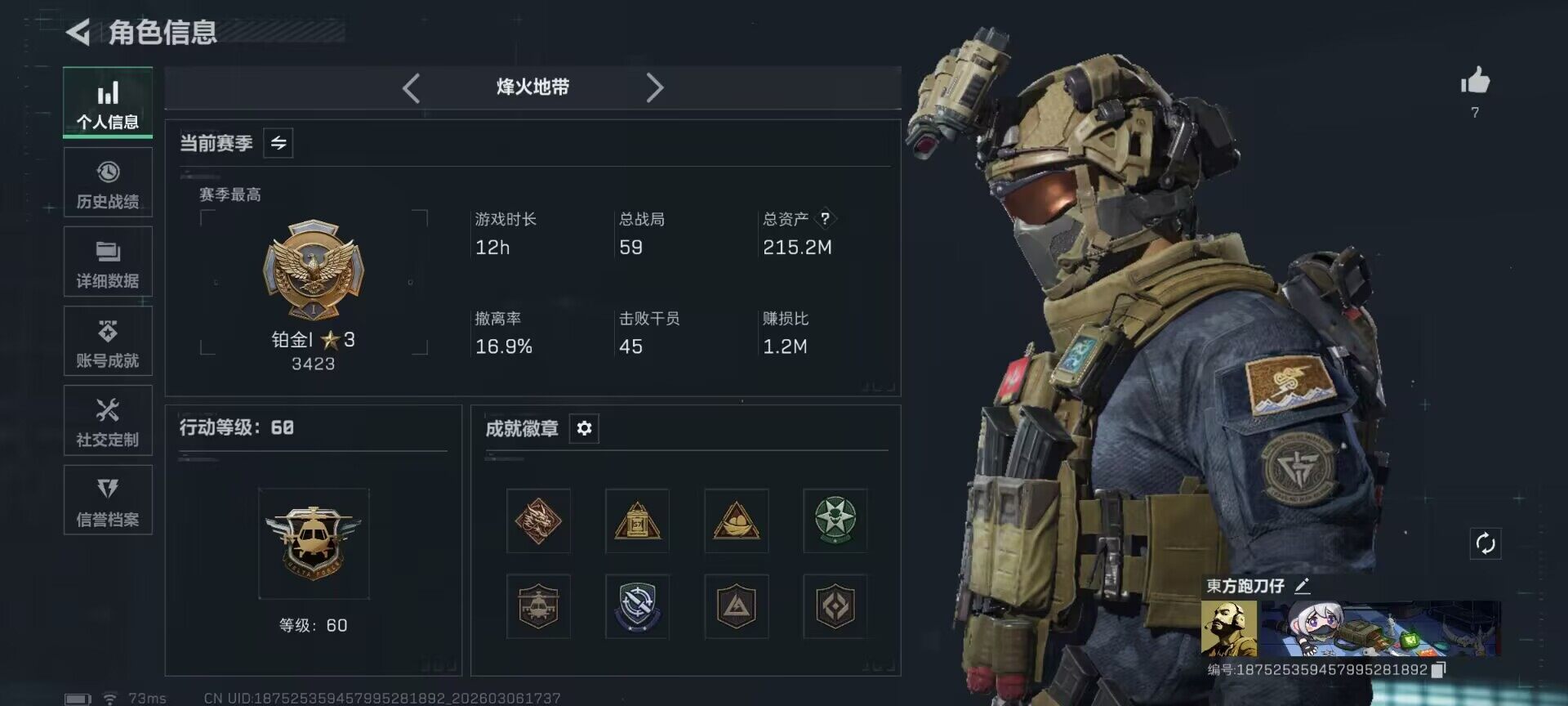 215m总资产-644k哈伏币-60烽火等级-铂金-42战场等级-军士长