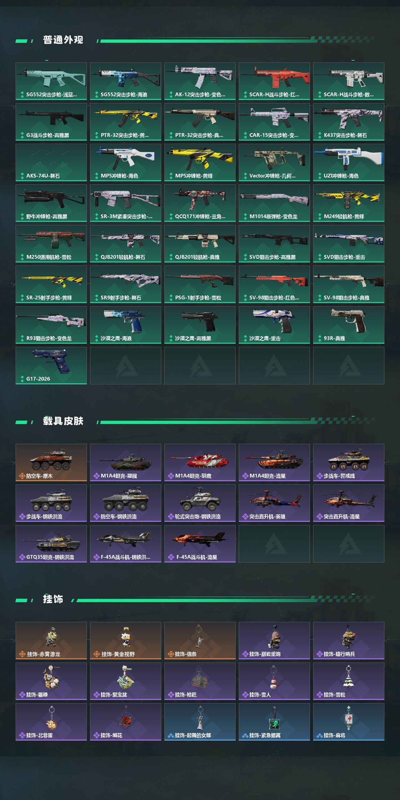 【传说外观】:AKM突击步枪-赤枭,ASh-12战斗步枪-哈夫克工业,M7战斗步枪-怜悯,SG552突击步枪-运动员,KC17突击步枪-电锯惊魂,P90冲锋枪-信条,PKM通用机枪-钢铁意志,M14射手步枪-蛮荒,M14射手步枪-缄花,SKS射手步枪-骑士,SR-25射手步枪-信条,SR-25射手步枪-缄花,.357左轮-缄花