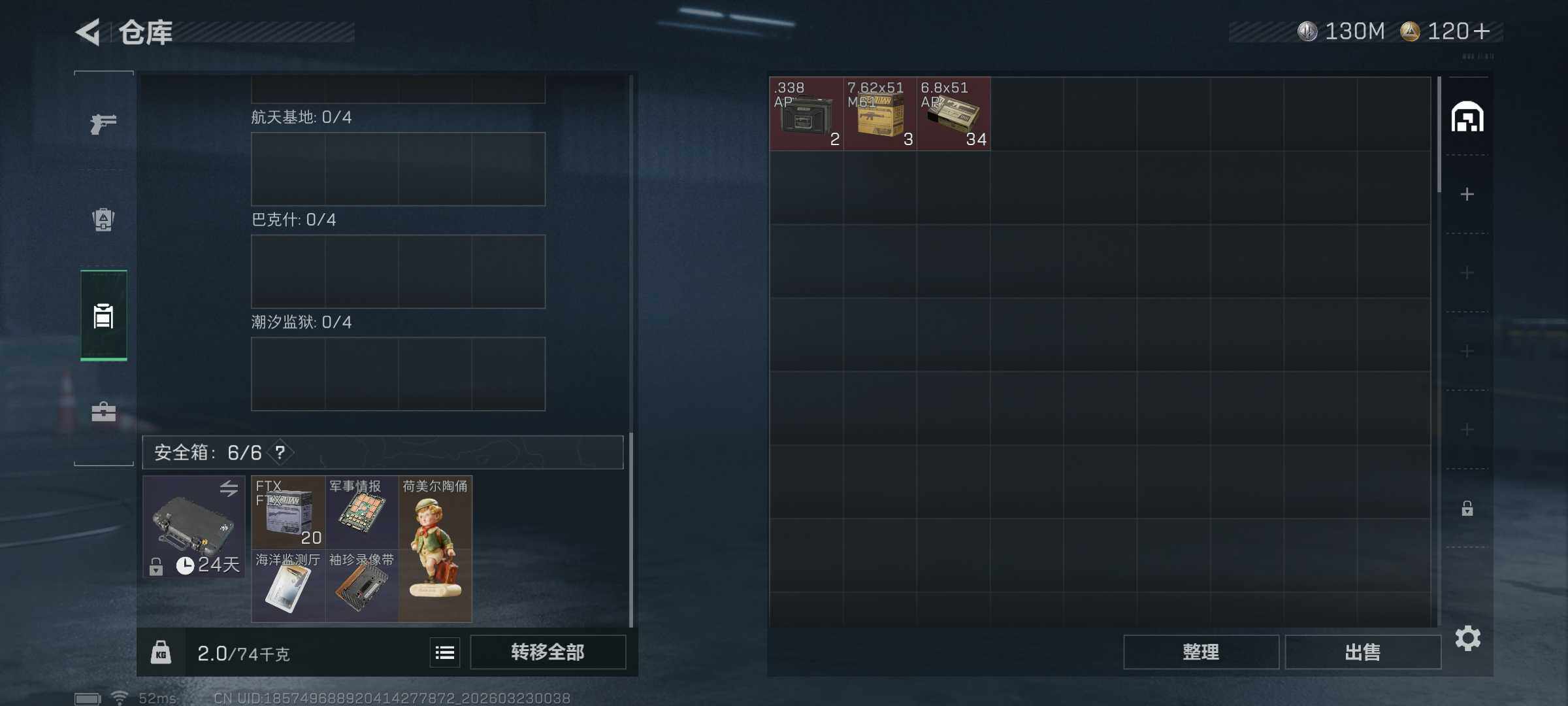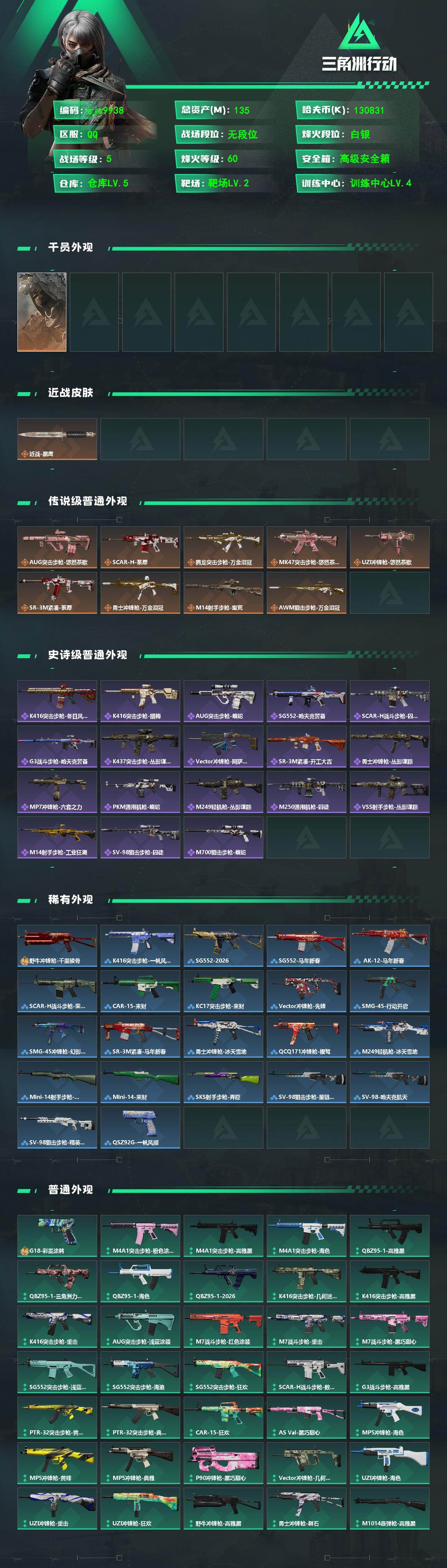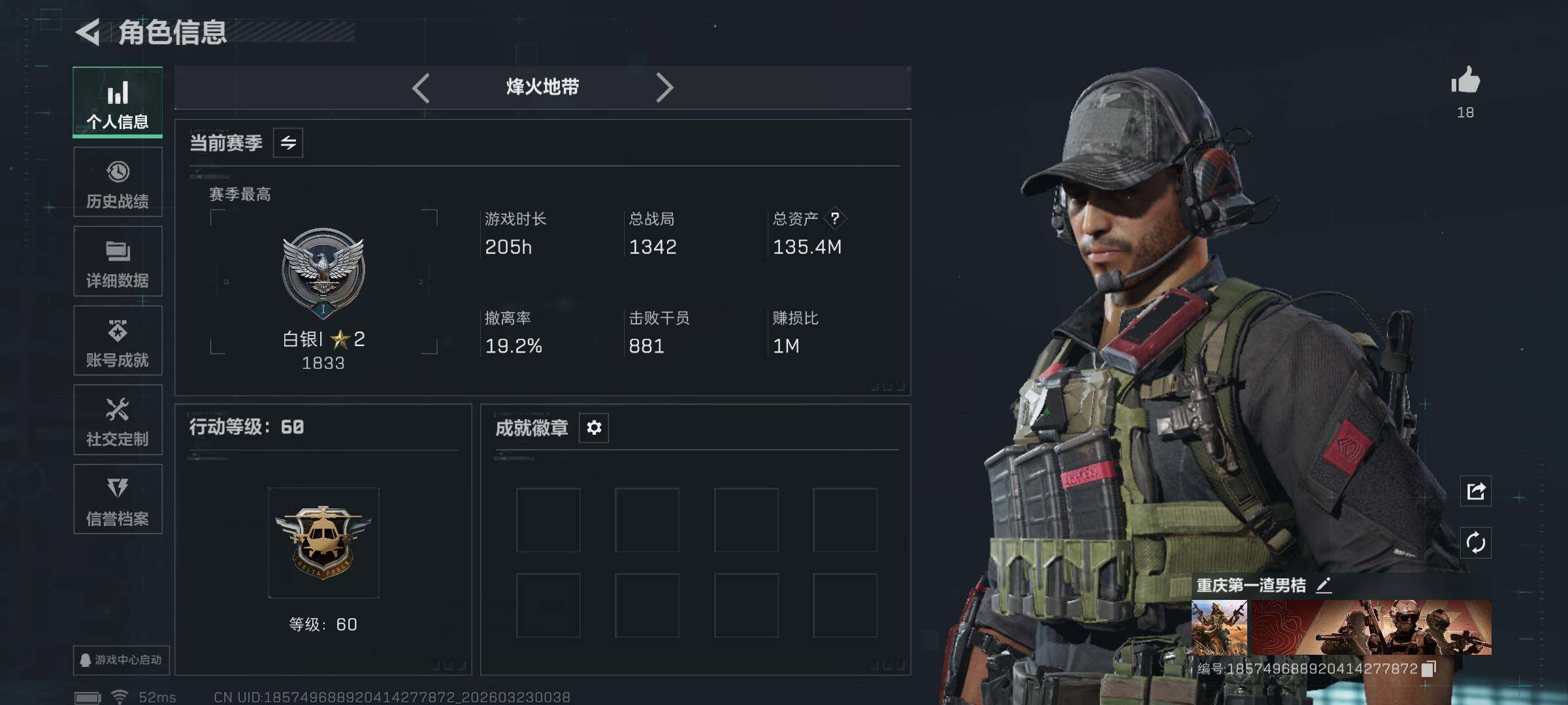 135m总资产-130831k哈夫币-60烽火等级-白银-5战场等级-无军衔