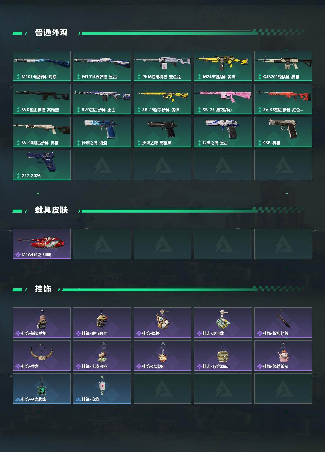 【传说外观】:AUG突击步枪-悠然茶歇,SCAR-H战斗步枪-荼蘼,腾龙突击步枪-万金泪冠,MK47突击步枪-悠然茶歇,UZI冲锋枪-悠然茶歇,SR-3M紧凑突击步枪-荼蘼,勇士冲锋枪-万金泪冠,M14射手步枪-蛮荒,AWM狙击步枪-万金泪冠