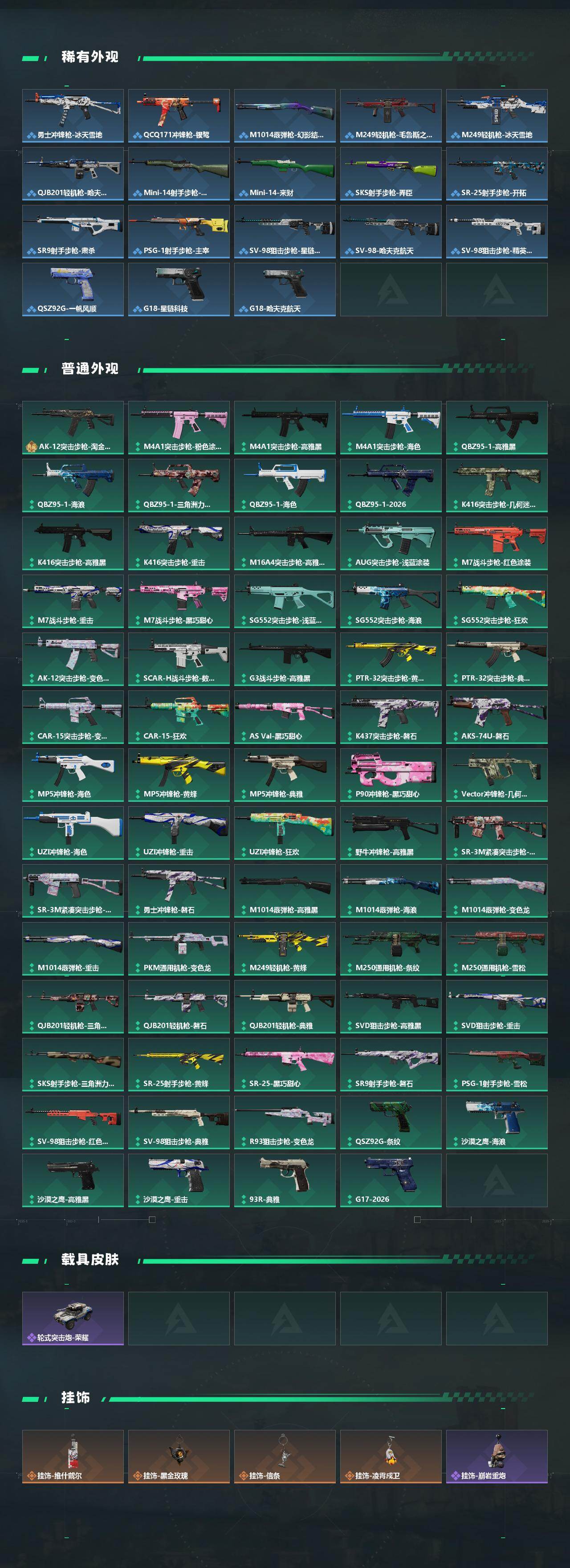【传说外观】:QBZ95-1突击步枪-凌霄戍卫,K416突击步枪-行动记录,AUG突击步枪-悠然茶歇,SG552突击步枪-运动员,SCAR-H战斗步枪-启航,SCAR-H战斗步枪-荼蘼,CAR-15突击步枪-阿米娅