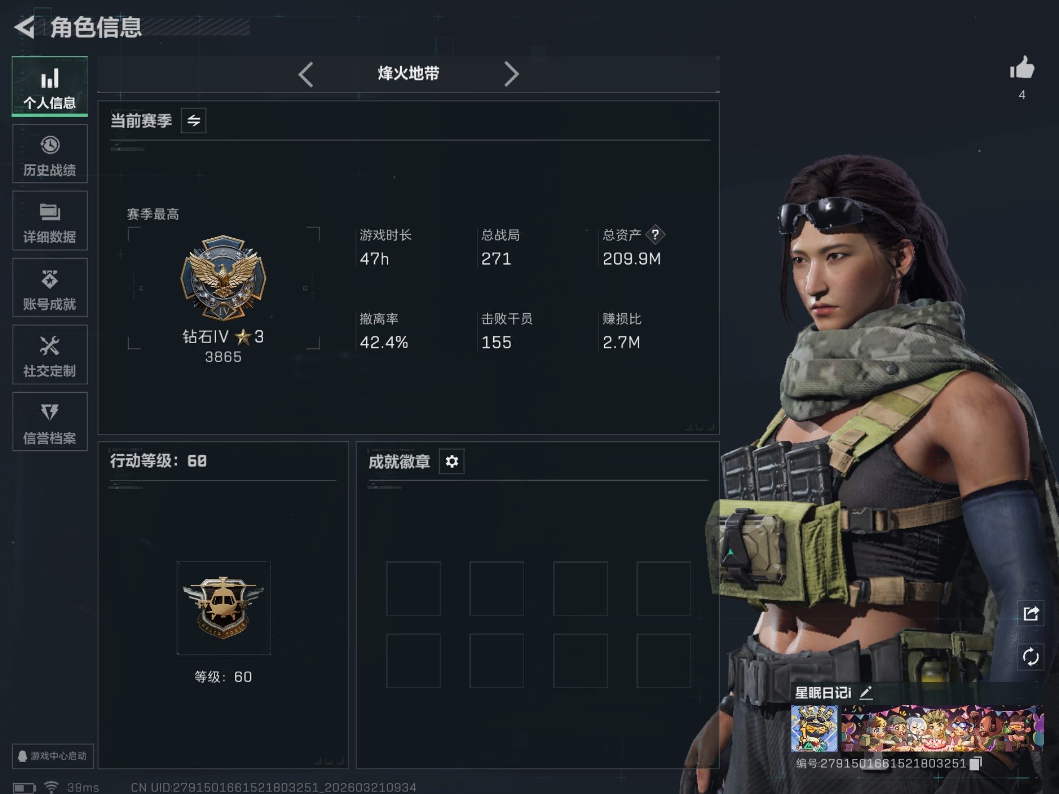 【特价出售/店主推荐】209m总资产-85351k哈夫币-60烽火等级-钻石-9战场等级-列兵