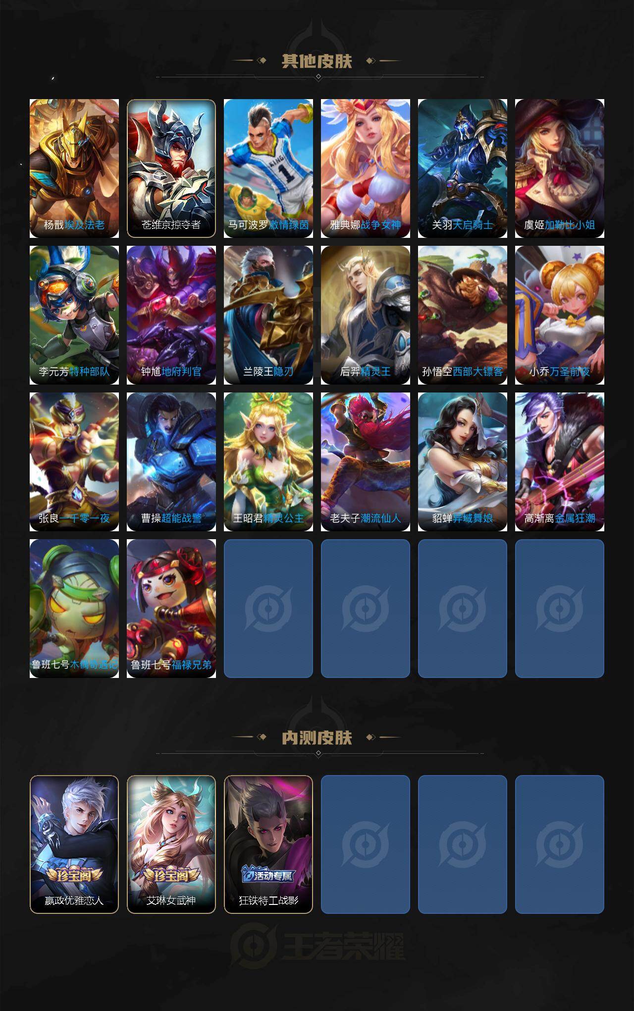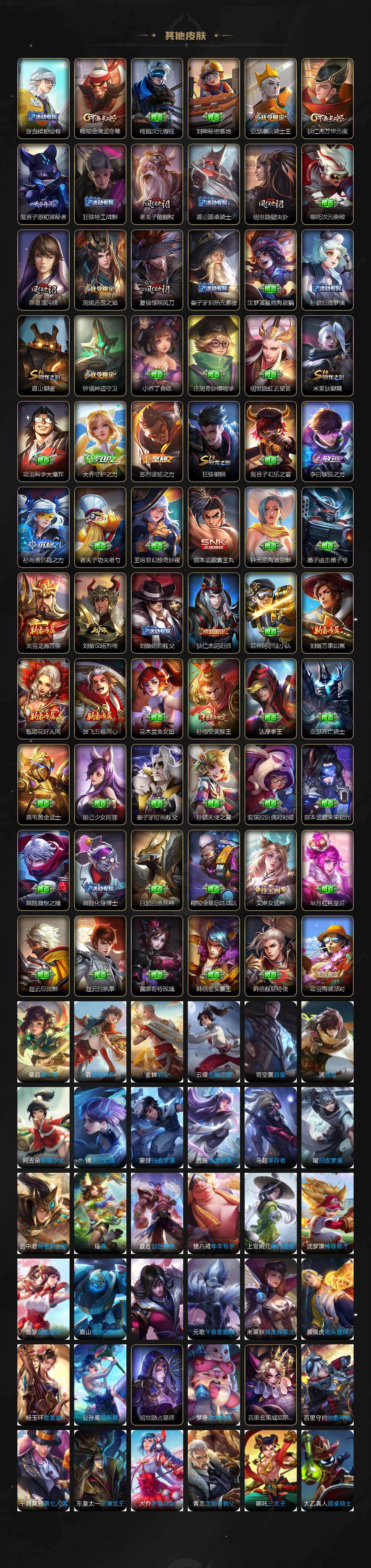 【传说皮肤】:后羿神树通天,桑启鸣野蒿,孙尚香乘龙问璇玑,赵云乘龙铭钟鼎,铠琥珀纪元,澜逐花归海,公孙离记忆之芯,干将莫邪画中仙,曜山海苍雷引,百里守约碎云,马超无双飞将,孙策挚爱之约,鲁班七号寅虎瑞焰,赵云淬星耀世,诸葛亮时雨天司,铠绛天战甲,虞姬启明星使,孙悟空零号赤焰,李信一念神魔,干将莫邪久胜战神,达摩黄金狮子座,百里玄策白虎志,后羿黄金射手座,孙尚香末日机甲,宫本武藏地狱之眼
