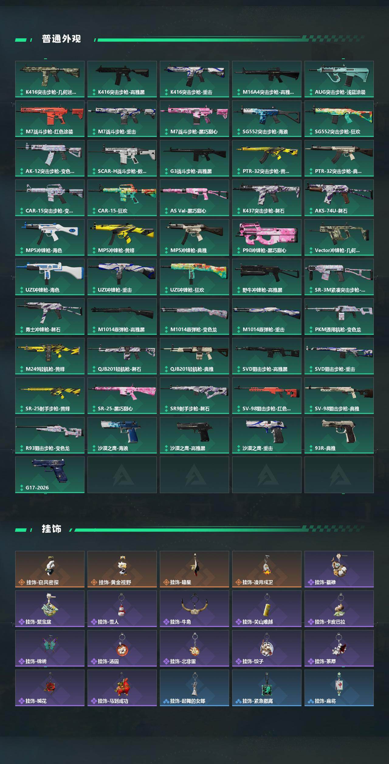 【传说外观】:AKM突击步枪-锦绣,QBZ95-1突击步枪-凌霄戍卫,K416突击步枪-行动记录,SG552突击步枪-运动员,SCAR-H战斗步枪-荼蘼,腾龙突击步枪-马年祥瑞,腾龙突击步枪-万金泪冠,K437突击步枪-锦绣,KC17突击步枪-电锯惊魂,MK