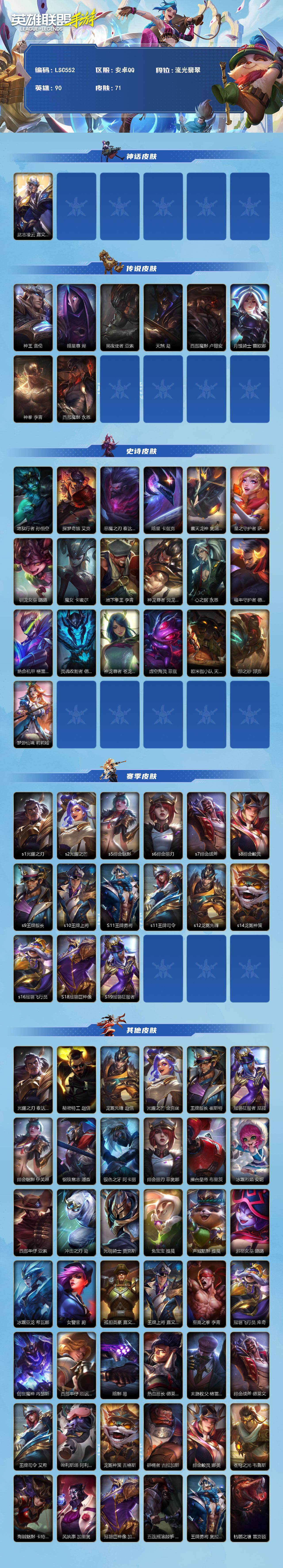 【LSC552】90英雄/71皮肤/1神话/8传说/19史诗/流光翡翠/此志凌云 嘉文四世/神王 盖伦/暗星尊 烬/黑夜使者 亚索/天煞 劫/西部魔影 卢锡安/月蚀骑士 蕾欧娜/神拳 李青/西部魔影 永恩/地狱行者 孙悟空/探梦奇旅 艾克/恶魔之刃 泰达米尔/暗星 卡兹克/霸天龙神 奥瑞利安·索尔/星之守护者 萨勒芬妮/驯龙女巫 璐璐/魔女 卡蜜尔/地下拳王 李青/神龙尊者 炎龙 瑟提/心之钢 永恩/福牛守护者 德莱厄斯/绝命机甲 格雷福斯/灵魂收割者 德莱文/神龙尊者 苍龙 艾希/虚空海灵 菲