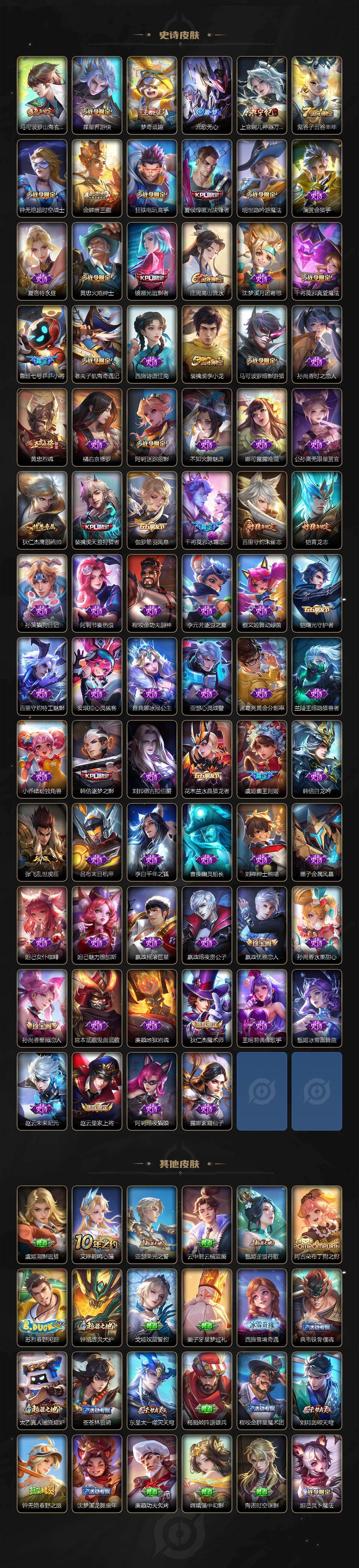 【传说皮肤】:后羿神树通天,云缨幻光神枪,李信山海炽霜斩,吕布怒海麟威,马超无双飞将,露娜启示之音,赵云淬星耀世,王昭君乞巧织情,曜李逍遥 ,周瑜音你心动,公孙离祈雪灵祝,铠绛天战甲,镜炽阳神光,虞姬启明星使,孙悟空零号赤焰,关羽武圣,曜云鹰飞将,貂蝉猫影幻舞,干将莫邪久胜战神,后羿黄金射手座,诸葛亮武陵仙君,孙尚香末日机甲,孙悟空地狱火