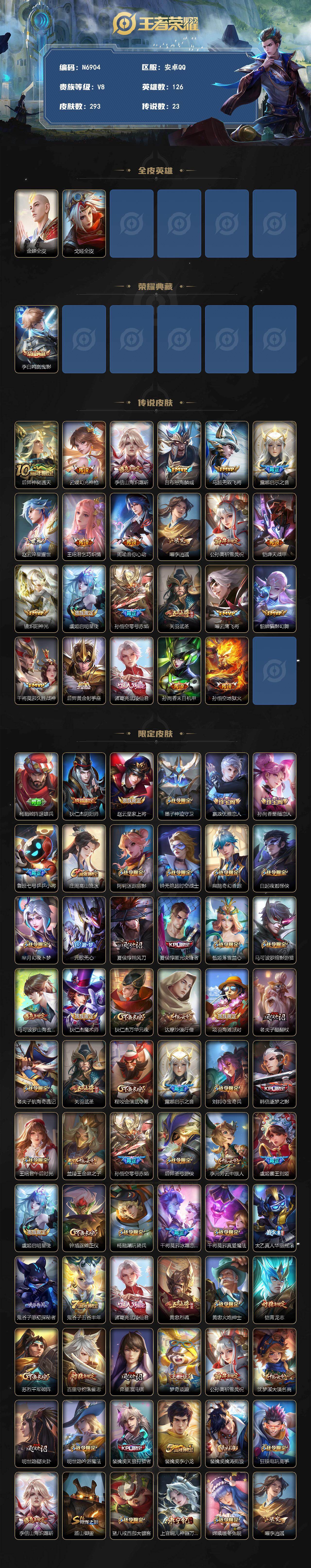 安卓Q-V8-最强王者段位-126英雄-293皮肤-1典藏皮肤-23传说-87史诗