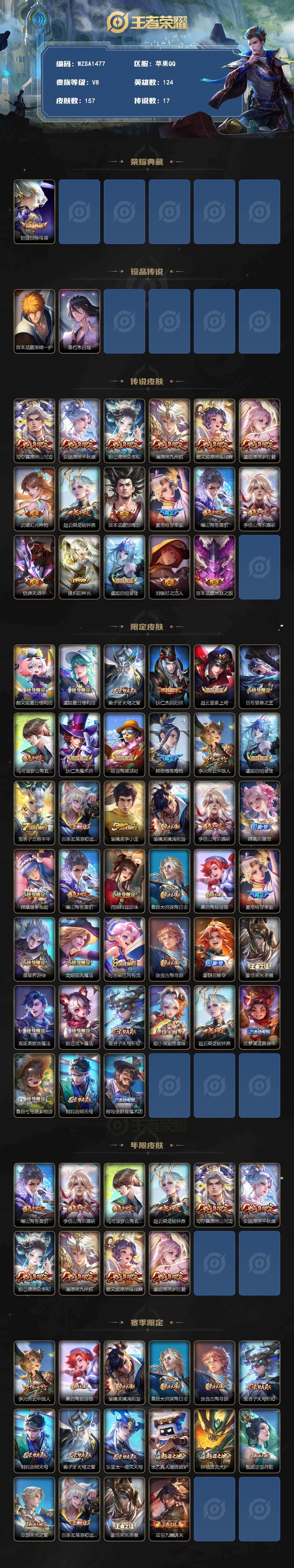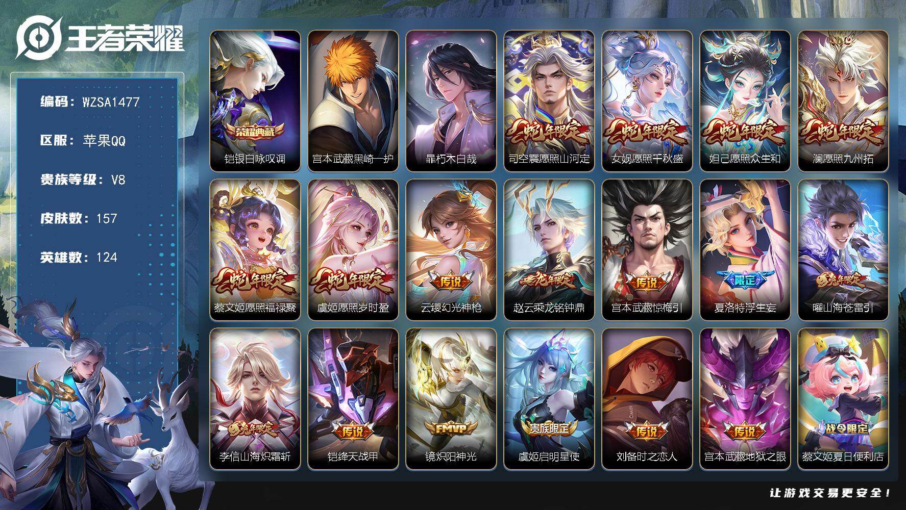 【WZSA1477】贵族8/皮肤157/典藏1/传说17/史诗41/英雄124/铠-银白咏叹调/宫本武藏黑崎一护/暃朽木白哉/司空震-愿照·山河定/女娲-愿照·千秋盛/妲己-愿照·众生和/澜-愿照·九州拓/蔡文姬-愿照·福禄聚/虞姬-愿照·岁时盈/云缨-幻光神枪/赵云-乘龙·铭钟鼎/宫本武藏-惊梅引/夏洛特-浮生妄/曜-山海·苍雷引/李信-山海·炽霜斩/铠-绛天战甲/镜-炽阳神光/虞姬-启明星使/刘备-时之恋人/宫本武藏-地狱之眼/蔡文姬-夏日便利店/虞姬-夏日便利店/姜子牙-天穹之誓/狄仁杰-