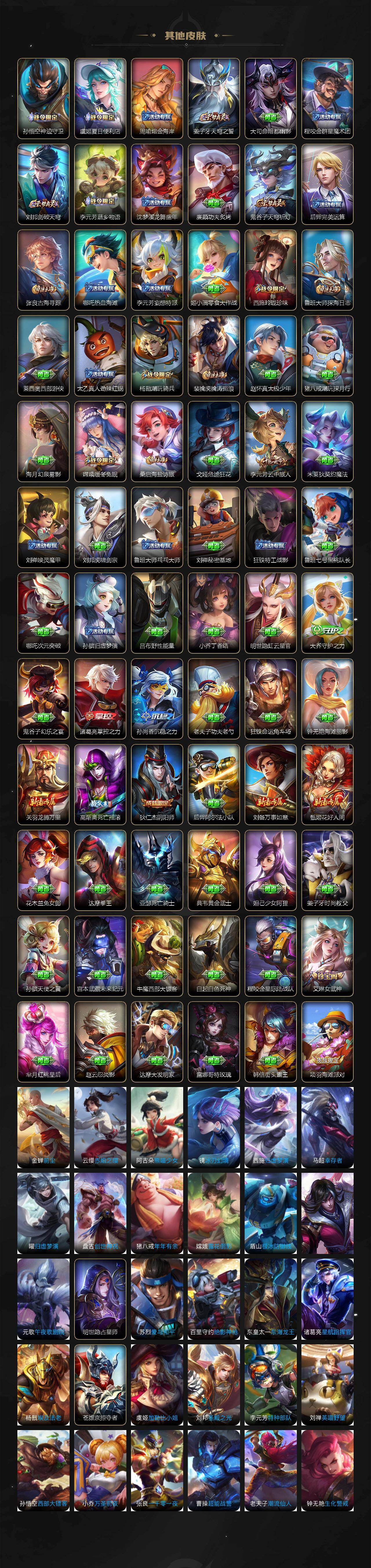 【限定皮肤】:蒙犽顽岩魄,蔡文姬夏日便利店,虞姬夏日便利店,姜子牙天穹之誓,李白谪仙醉月,狄仁杰阴阳师,赵云皇家上将,赵云引擎之心,高渐离死亡摇滚,扁鹊奇