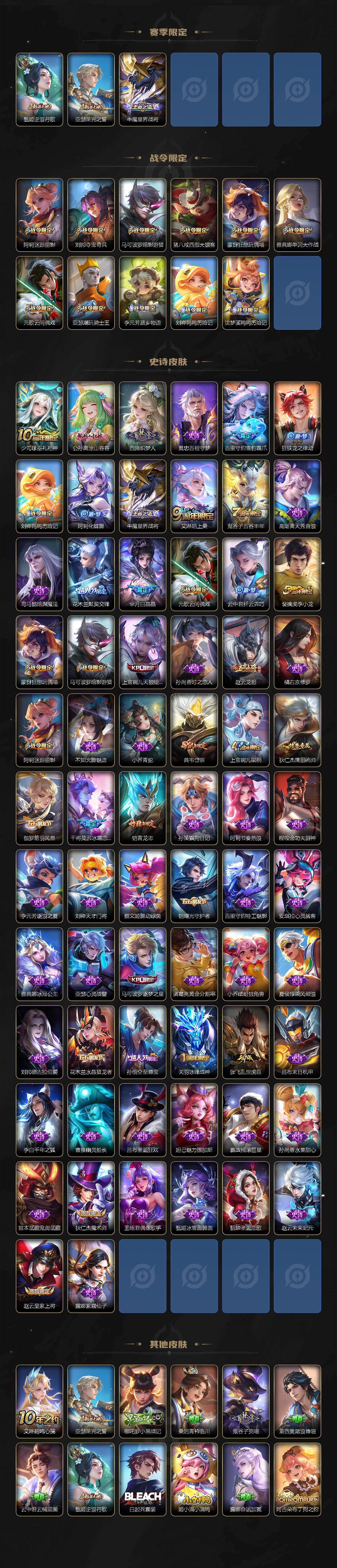 【限定皮肤】:狄仁杰阴阳师,赵云皇家上将,赵云龙胆,高渐离玩趣恶龙,阿轲迷踪丽影,芈月白晶晶,元歌云间偶戏,夏侯惇朔风刀,典韦岱宗,马可波罗逐梦之星,马可波罗暗影游猎,狄仁杰魔术师,狄仁杰万华元夜,
