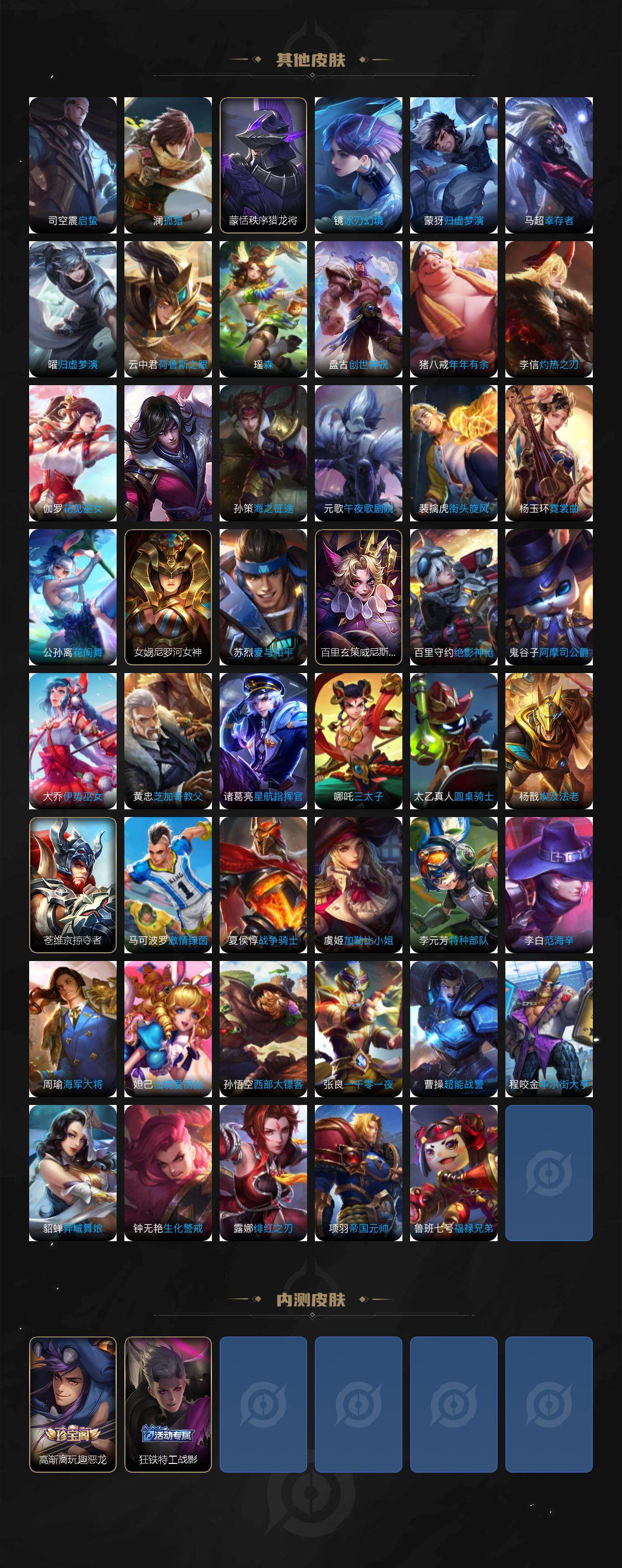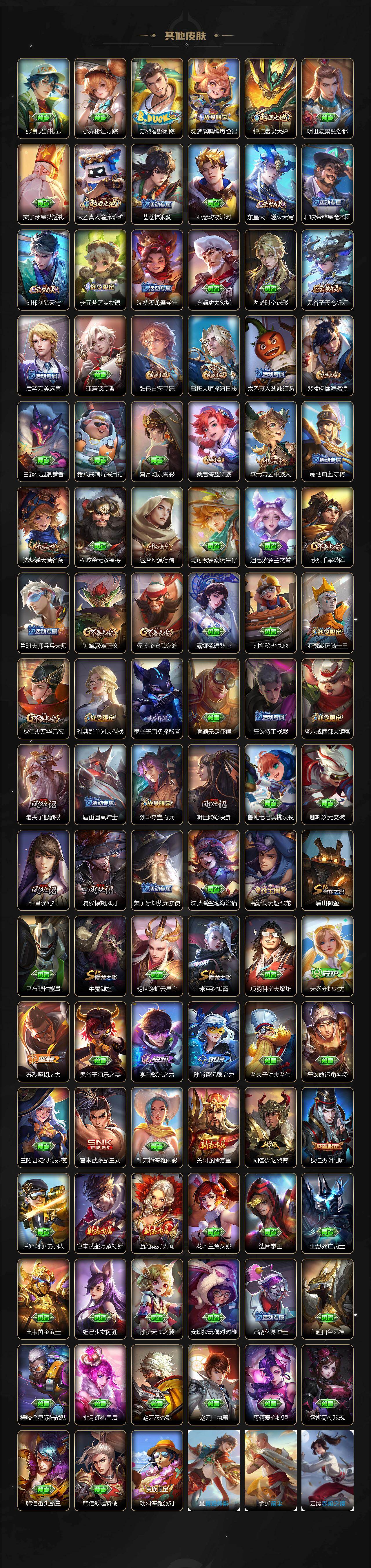 【传说皮肤】:后羿神树通天,司空震愿照山河定,澜愿照九州拓,桑启鸣野蒿,庄周牧神诗旅,马超无双飞将,虞姬启明星使,李信一念神魔,干将莫邪久胜战神,达摩黄金狮子座,百里玄策白虎志,后羿黄金射手座,宫本武藏地狱之眼,狄仁杰超时空战士