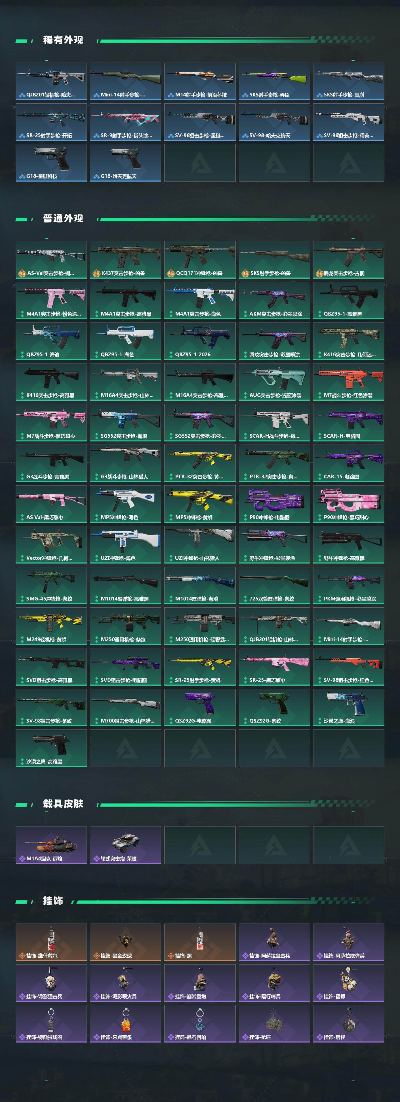 【传说外观】:M4A1突击步枪-蚀金玫瑰,M4A1突击步枪-阿米娅,ASh-12战斗步枪-鹅鸭杀,AK-12突击步枪-特斯拉线圈,SCAR-H战斗步枪-启航,G3战斗步枪-骑士,CAR-15突击步枪-阿米娅,腾龙突击步枪-捞点薯