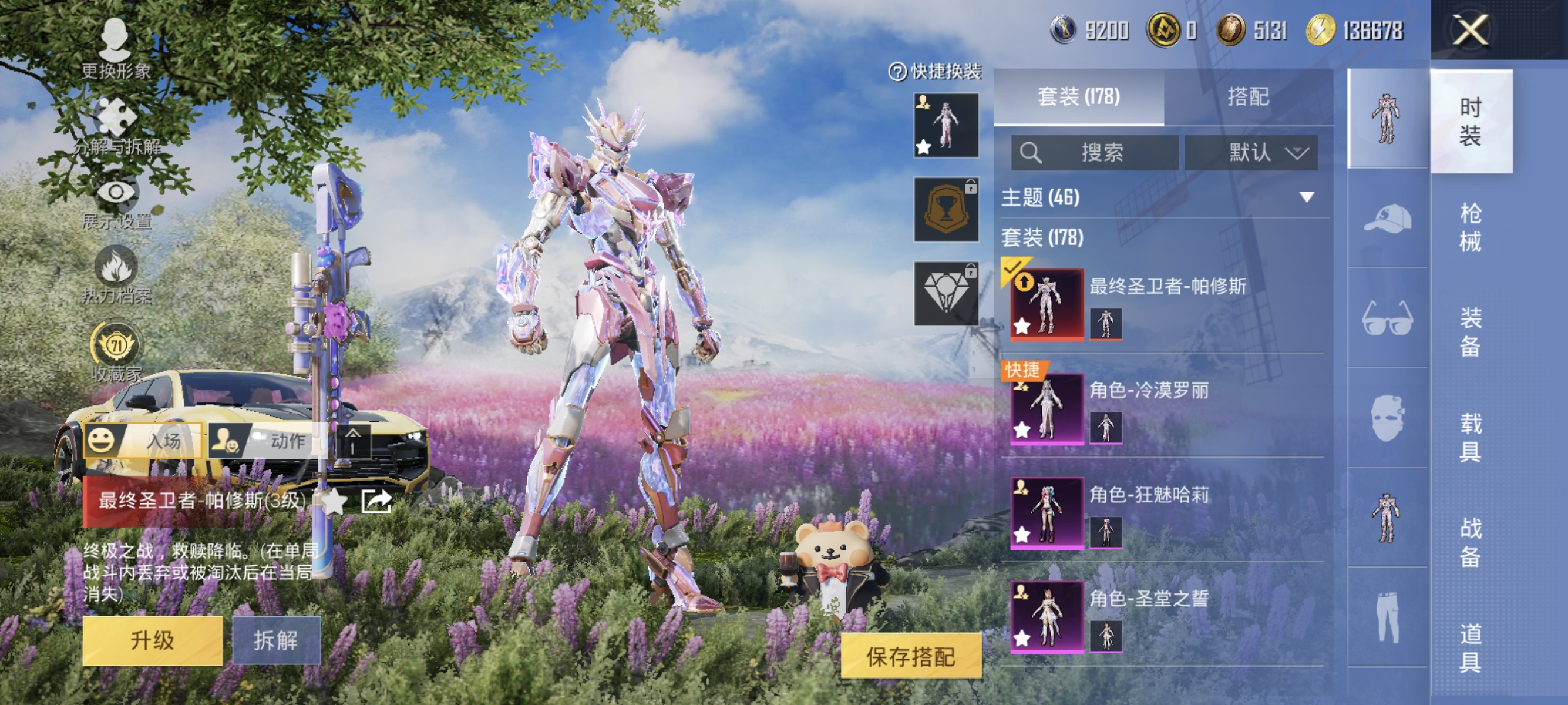 【3级红装小丑女猫包10特效枪6粉装1载具 秒换绑不用等】 安卓Q区-83292热力值-178套装-263枪皮 【1红装】 最终圣卫者-帕修斯(3级)【1载具】 永恒黄蜂【2稀有】 百万伏待背包(猫包) AKM-百万伏特【6粉装】 狂魅哈莉(小丑女) 圣堂之誓 甜蜜誓约 海渊国主 角色-冷漠罗丽 星穹咏叹调【10特效枪】 M416-心之恋语(7级) SCAR-L-锦绣绵绵(5级) MG3-梦幻舞会(5级) AKM-绿萝繁花(5级) Kar98K-巳巳如意(5级) P90-冷漠罗丽(4级) Mk1