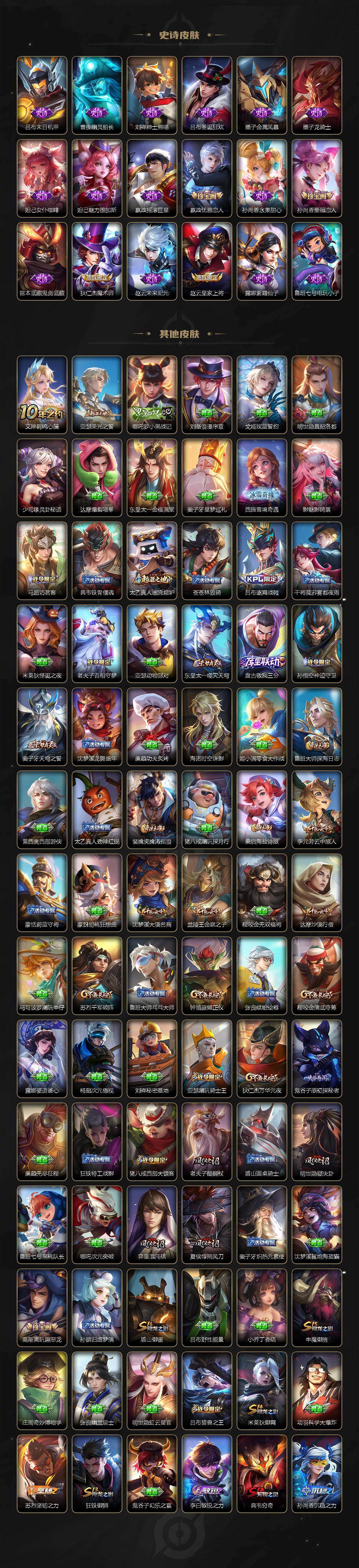 【传说皮肤】:后羿神树通天,干将莫邪千山共赴,西施续相思,司空震愿照山河定,澜愿照九州拓,虞姬愿照岁时盈,云缨幻光神枪,裴擒虎祥瑞亨通,嬴政玄雷天君,桑启鸣野蒿,花木兰燃星之曲,吕布怒海麟威,马超无双飞将,小乔音你心动,铠绛天战甲,虞姬启明星使,关羽武圣,李信一念神魔,梦奇胖达荣荣,貂蝉仲夏夜之梦,孙