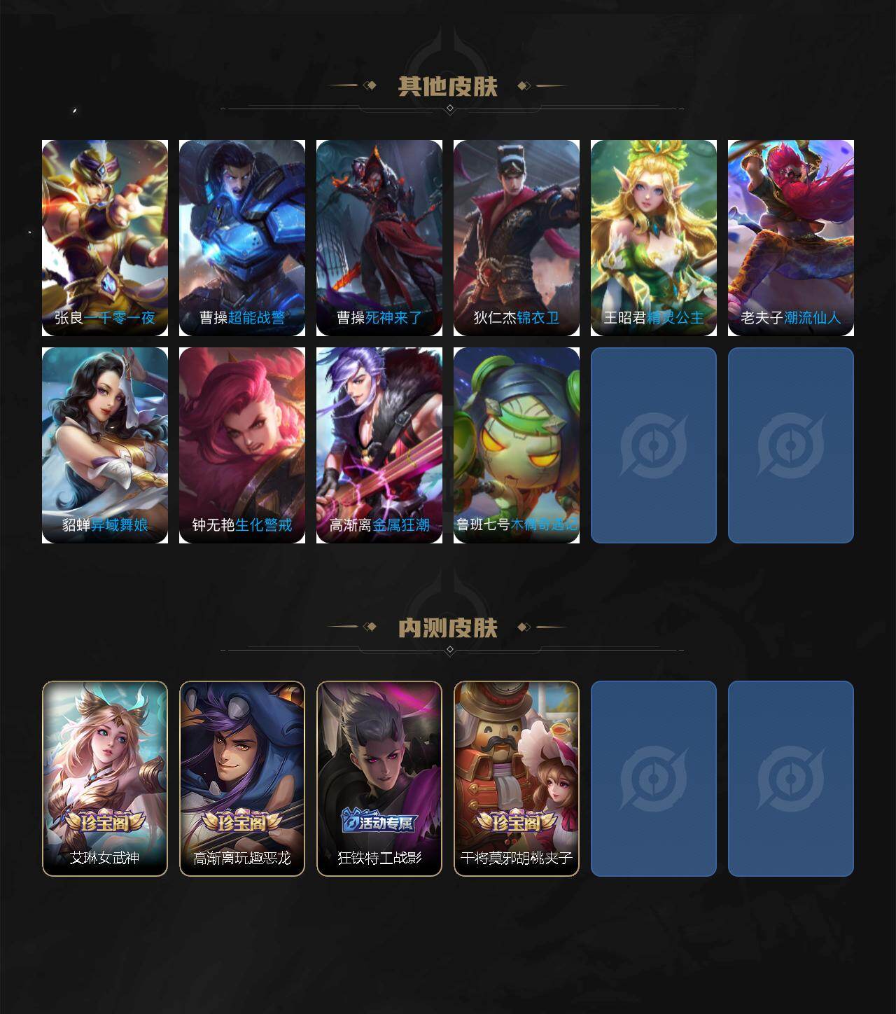 【传说皮肤】:公孙离云诺千山,司空震愿照山河定,桑启鸣野蒿,澜逐花归海,夏洛特浮生妄,吕布怒海麟威,李白诗剑行,孙策末日机甲,镜炽阳神光,虞姬启明星使,孙悟空零号赤焰,曜云鹰飞将,李信一念神魔,刘备时之恋人,貂蝉猫影幻舞,干将莫邪久胜战神,达摩黄金狮子座,百里玄策白虎志,梦奇胖达荣荣,后羿黄金射手座,李白凤求凰,孙尚