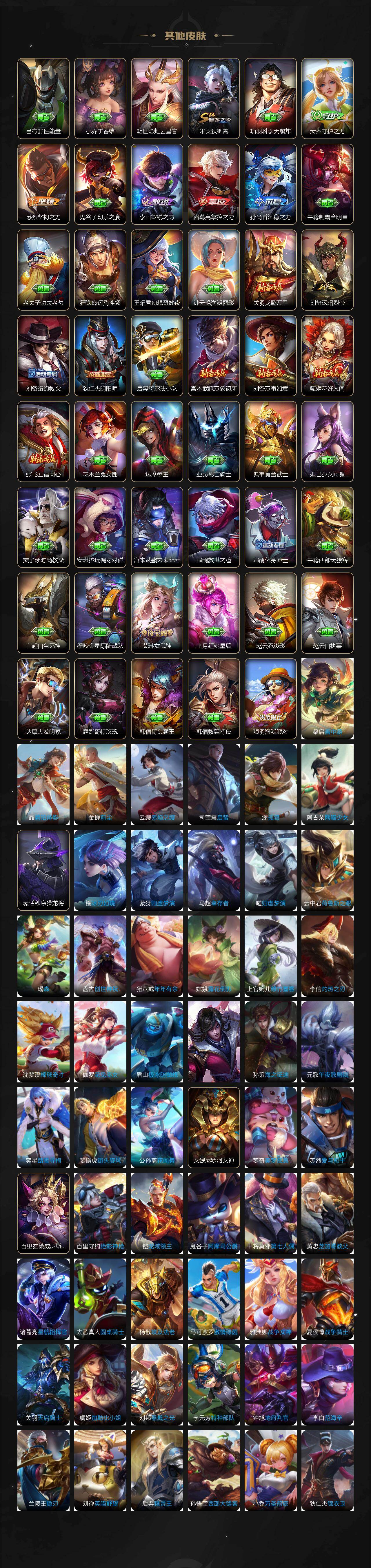 【传说皮肤】:后羿神树通天,澜愿照九州拓,桑启鸣野蒿,澜逐花归海,李信山海炽霜斩,吕布怒海麟威,橘右京枫霜尽,马超无双飞将,干将莫邪久胜战神,达摩黄金狮子座,孙尚香末日机甲,宫本武藏地狱之眼,狄仁杰超时空战士