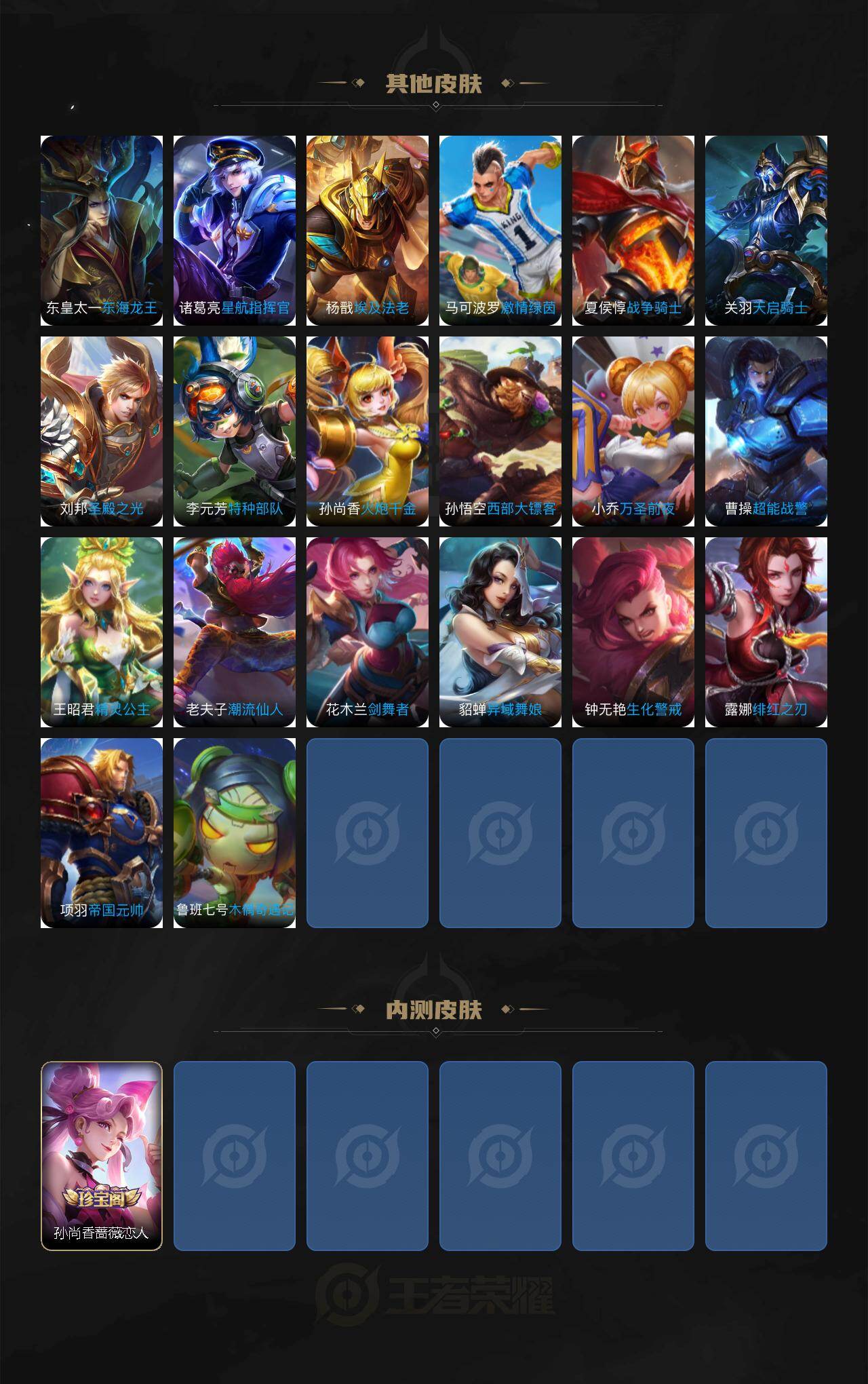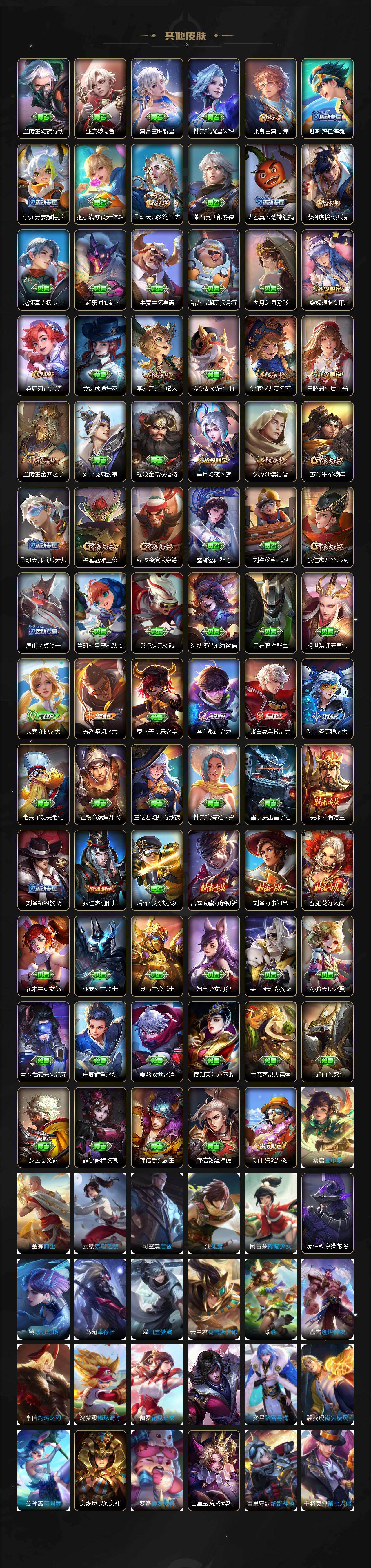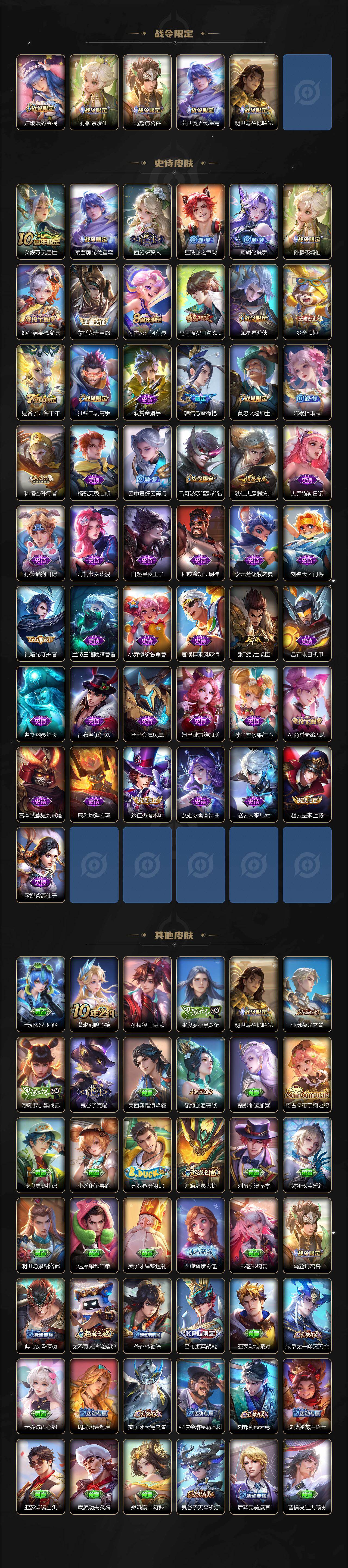 【限定皮肤】:大乔绒语心约,姜子牙天穹之誓,狄仁杰阴阳师,赵云皇家上将,孙尚香蔷薇恋人,芈月幻夜卜梦,马可波罗暗影游猎,马可波罗山海玄木吟,狄仁杰魔术师,狄仁杰万华元夜,达摩沙漠行僧,项羽海滩派对,程咬金演武夺