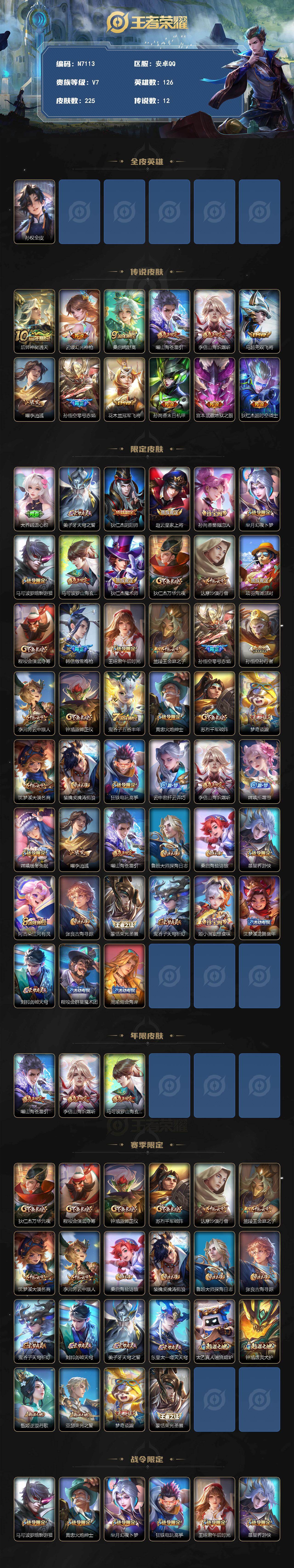 安卓Q-V7-最强王者段位-126英雄-225皮肤-12传说-49史诗【英雄全