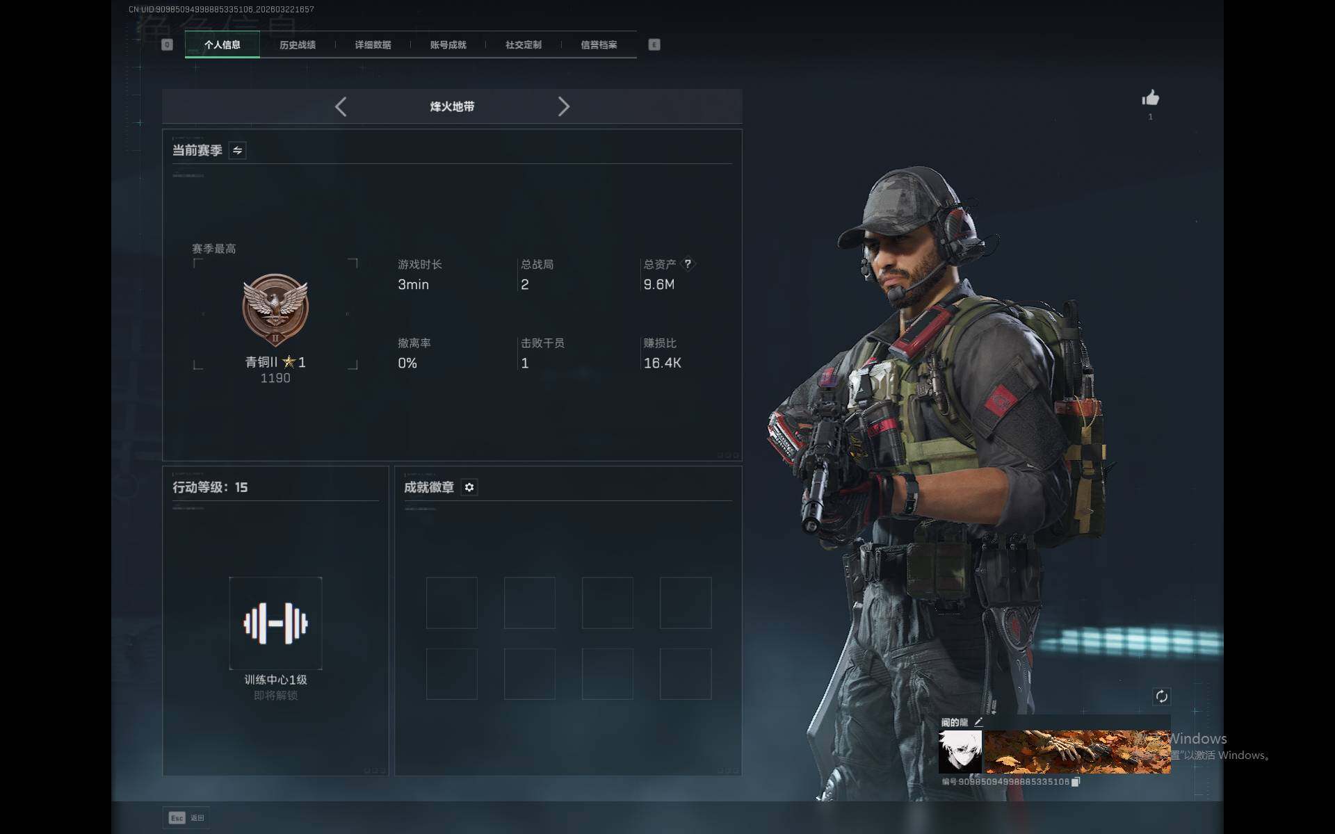 9m总资产-7976k哈夫币-15烽火等级-青铜-1战场等级-无军衔