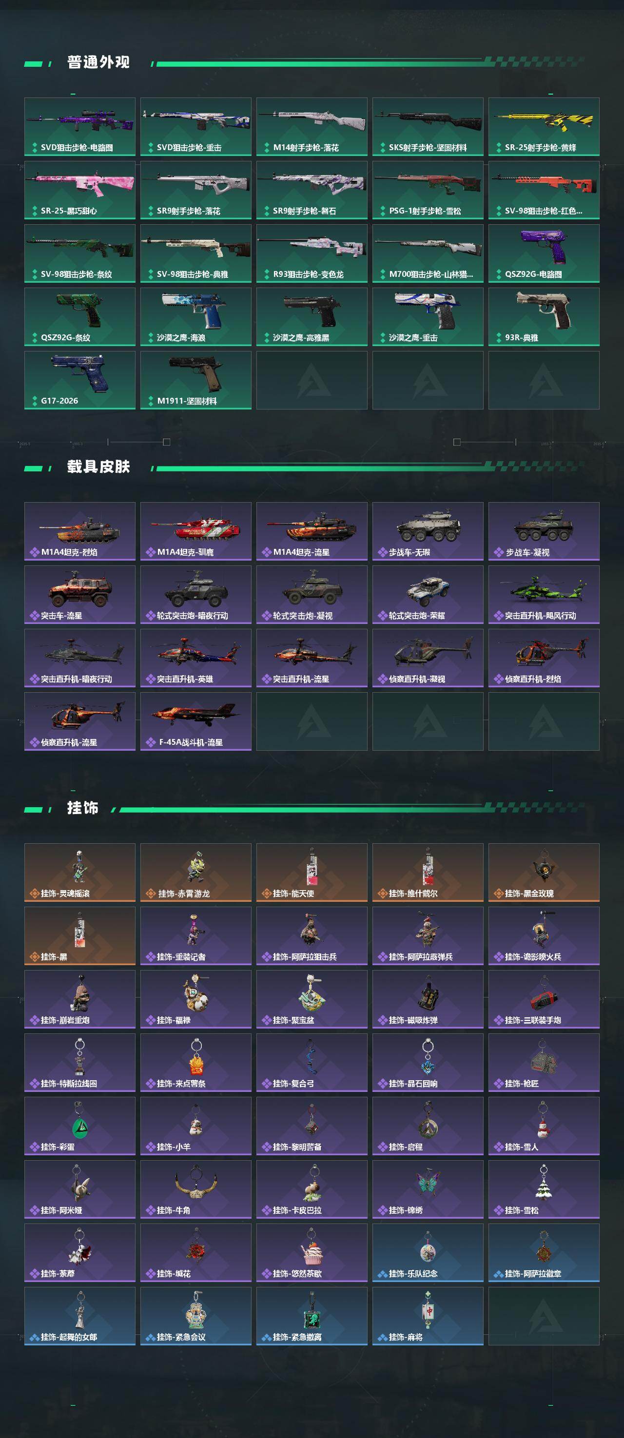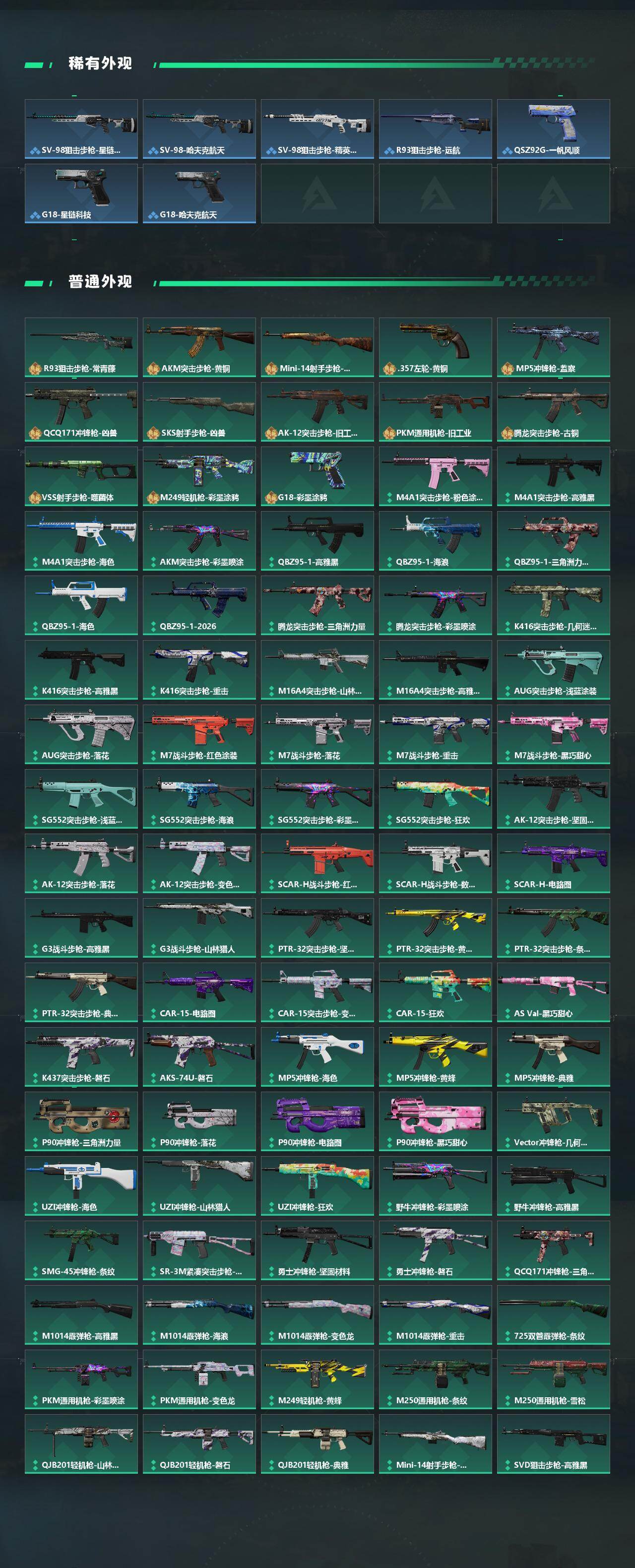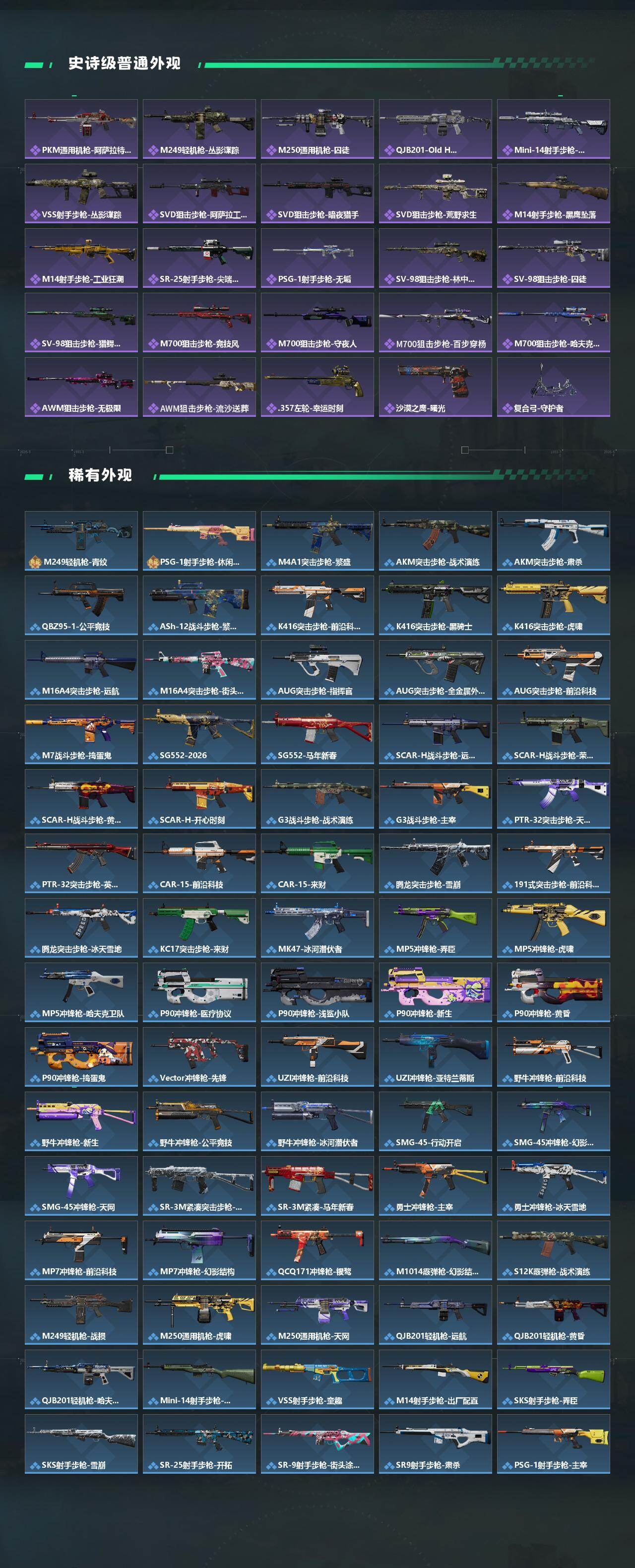 【传说外观】:M4A1突击步枪-蚀金玫瑰,M4A1突击步枪-阿米娅,AKM突击步枪-黎明警戒,AKM突击步枪-锦绣,AUG突击步枪-悠然茶歇,SG552突击步枪-运动员,AK-12突击步枪-夜鹰,AK-1
