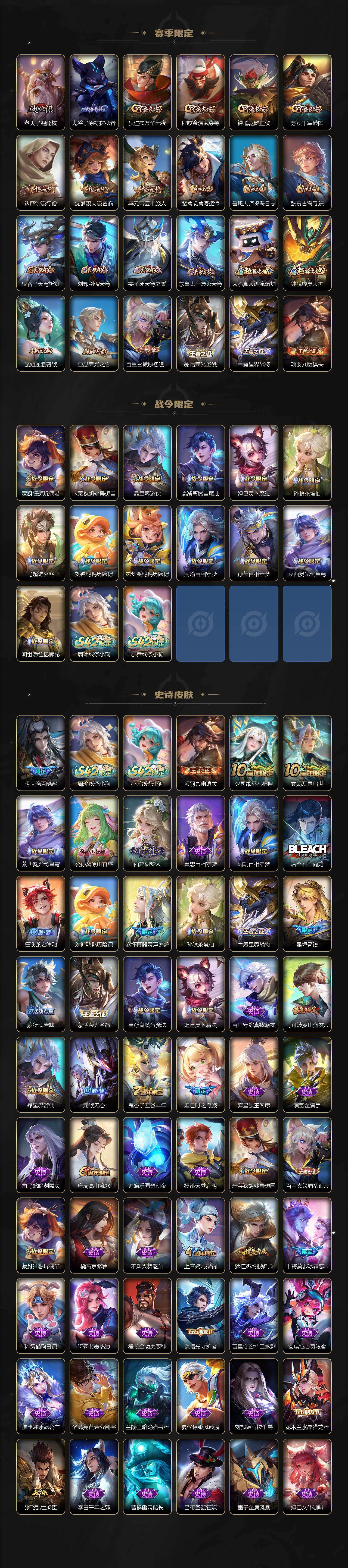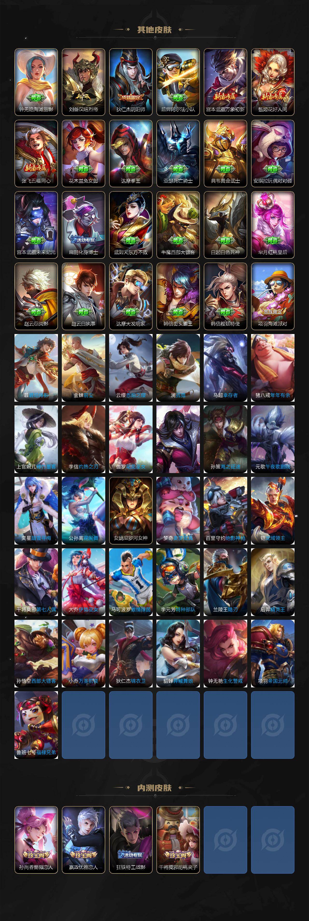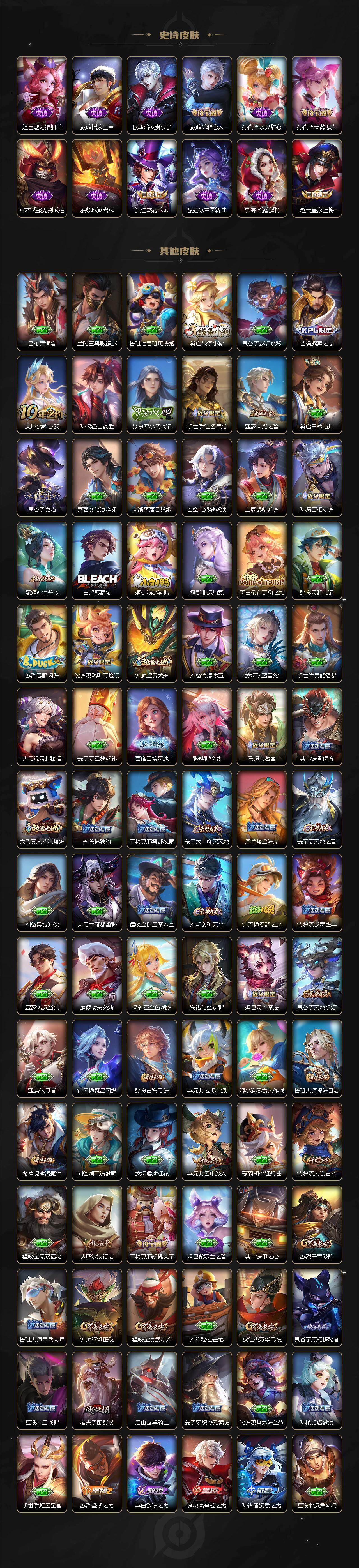【传说皮肤】:阿轲罗刹妄海,貂蝉神骥聚万邦,后羿神树通天,干将莫邪千山共赴,司空震愿照山河定,女娲愿照千秋盛,妲己愿照众生和,澜愿照九州拓,蔡文姬愿照福禄聚,虞姬愿照岁时盈,云缨幻光神枪,桑启鸣野蒿,孙策乘龙淬吴钩,赵云乘龙铭钟鼎,马可波罗妄想实况,李白诗剑行,镜炽阳神光,干将莫邪久胜战神,百里玄策白