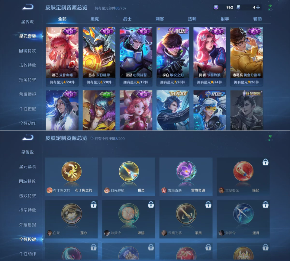 【史诗皮肤】 克喵 星界战将 踏浪烽翎 涂山容容 死霸装 灵野札记 虚灵犬护 谧流熔炉 劲辣红锅 线条小狗 九幽镇关 万灵启世 罗小黑战记 聚星闪耀 玫蓝誓约 江河有灵 命运加冕 铁骨偃魂 苍林狼骑 完美运算 顽岩魄 逆浪荇歌 幽灵