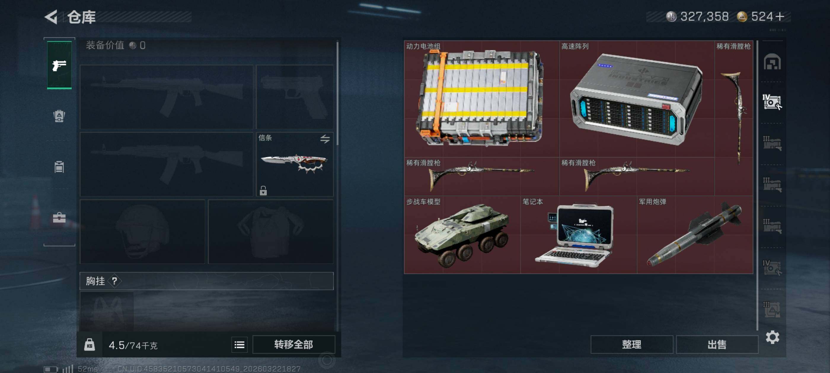 {特价出售}等级:60总资产:132.2M 纯币327358 刀皮 信条 特勤处:仓库7,训练2,靶场2