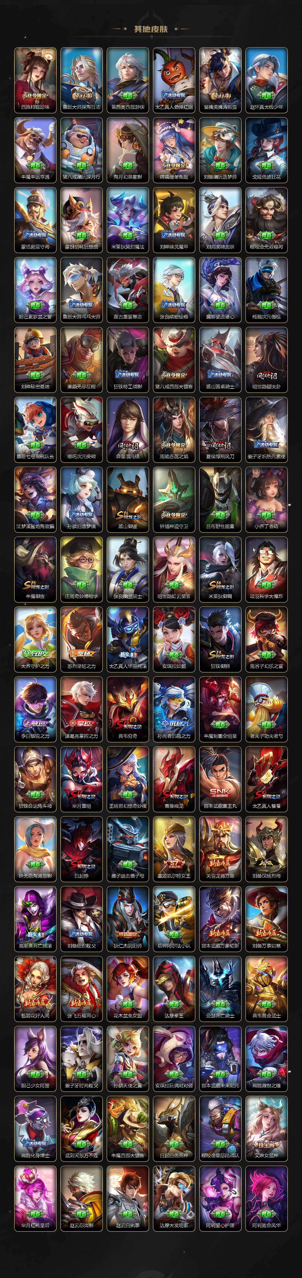 【英雄全皮】:廉颇全皮,夏侯惇全皮,武则天全皮,孙权全皮,不知火舞全皮,娜可露露全皮,橘右京全皮,苍全皮,铠全皮,狂铁全皮,盾山全皮,猪八戒全皮,曜全皮,夏洛特全皮,司空震全皮,金蝉全皮,戈娅全皮,空空儿全皮,少司缘全皮