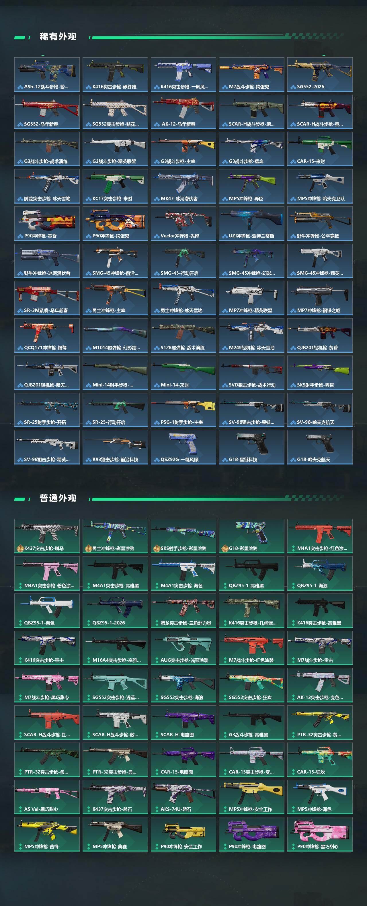 【传说外观】:M4A1突击步枪-阿米娅,QBZ95-1突击步枪-凌霄戍卫,ASh-12战斗步枪-鹅鸭杀,K416突击步枪-行动记录,M7战斗步枪-怜悯,SG552突击步枪-运动员,SG552突击步枪-点翠,SCAR-H战斗步枪-启航,G3战斗步枪-骑士,CAR-15突击步枪-