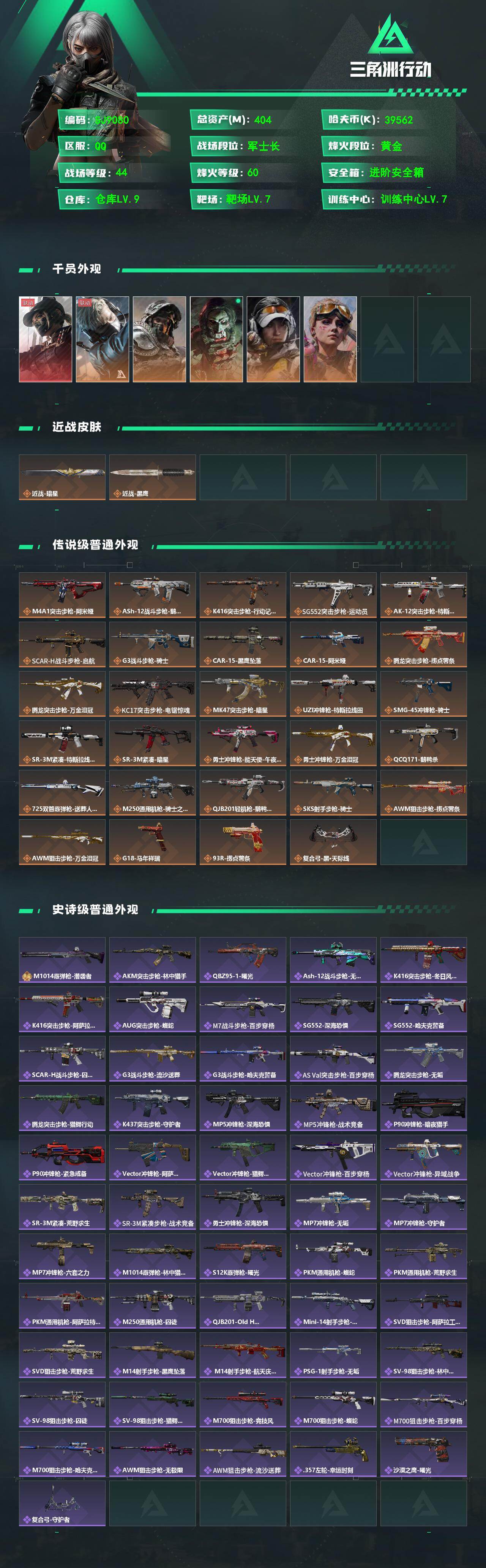 【SJ9080】总资产(M):404M/哈夫币(K):39562K/哈夫币(K):39562K/传说枪皮数:29/全面战场等级:44_段位:军士长/烽火地带等级:60_段位:黄金/藏品-非洲之心/露娜-黑·天际线/蜂医-送葬人·无题密令/深蓝-不破誓约/红狼-电锯惊魂/露娜-金牌射手/蛊-不羁人生/近战-暗星/近战-黑鹰/M4A1突击步枪-阿米娅/ASh-12战斗步枪-鹅鸭杀/K416突击步枪-行动记录/SG552突击步枪-运动员/AK-12突击步枪-特斯拉线圈/SCAR-H战斗步枪-启航/G3