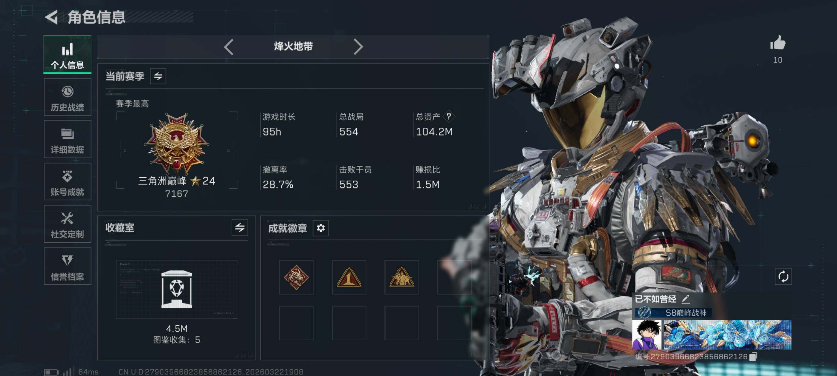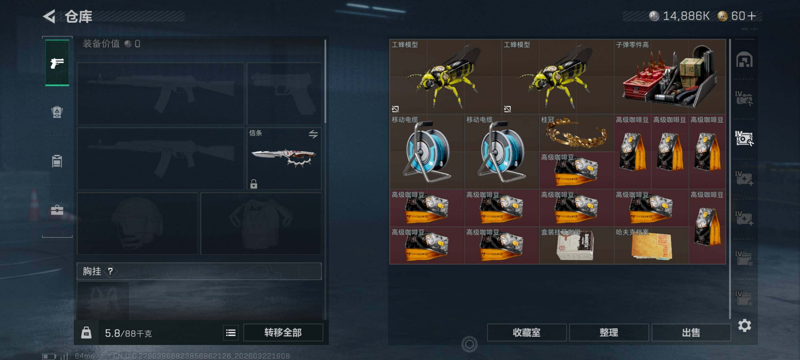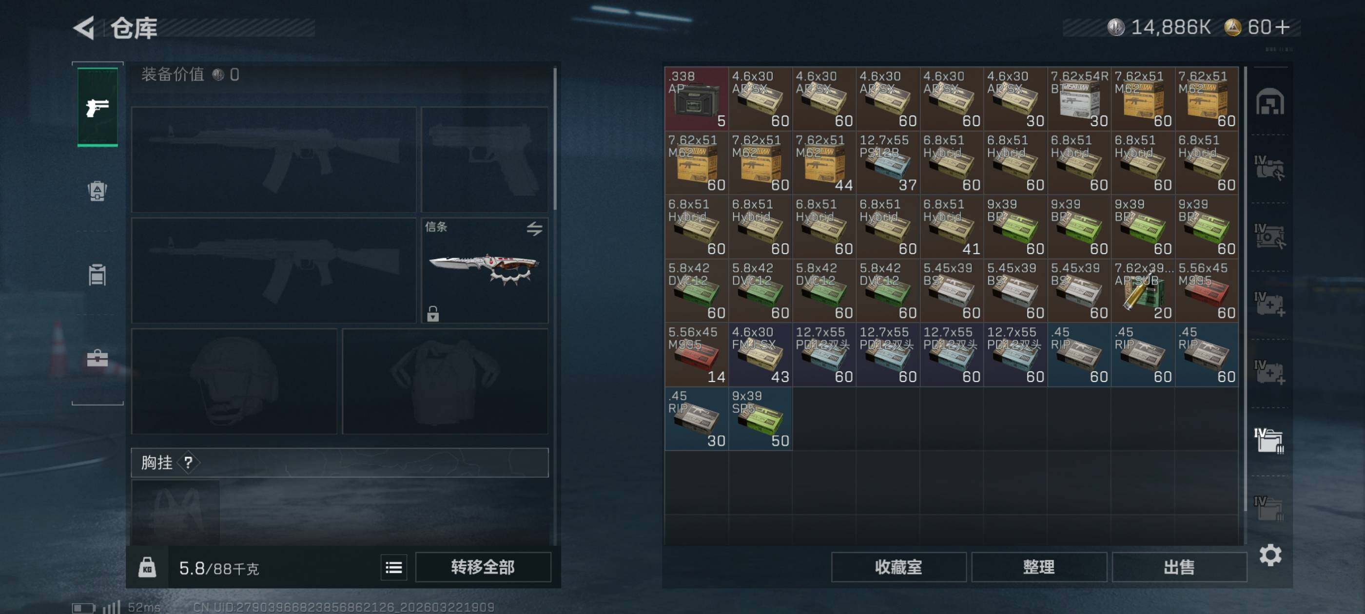 {特价出售}等级:60总资产:103.6M 纯币14886k 隐藏挂饰:财神到2s 红皮:维什戴尔‘凌霄戍卫’ 刀皮 信条砖皮:ASVal赏金令优品c 特勤处:仓库7,训练,7靶场7