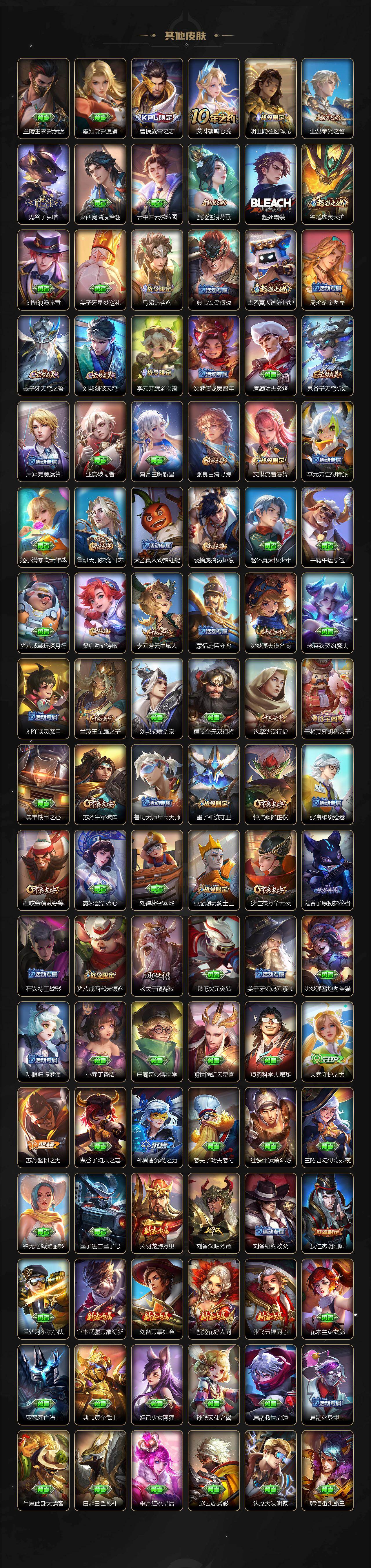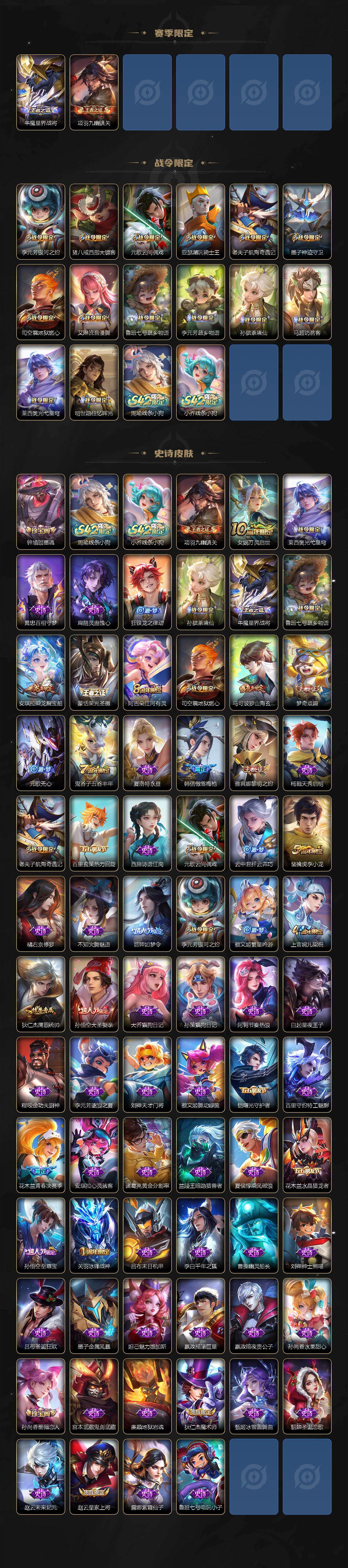【限定皮肤】:姜子牙天穹之誓,狄仁杰阴阳师,赵云皇家上将,墨子神迹守卫,孙尚香蔷薇恋人,元歌云间偶戏,元歌无心,马可波罗山海玄木吟,狄仁杰魔术师,狄仁杰万华元夜,达摩沙漠行僧,项羽海