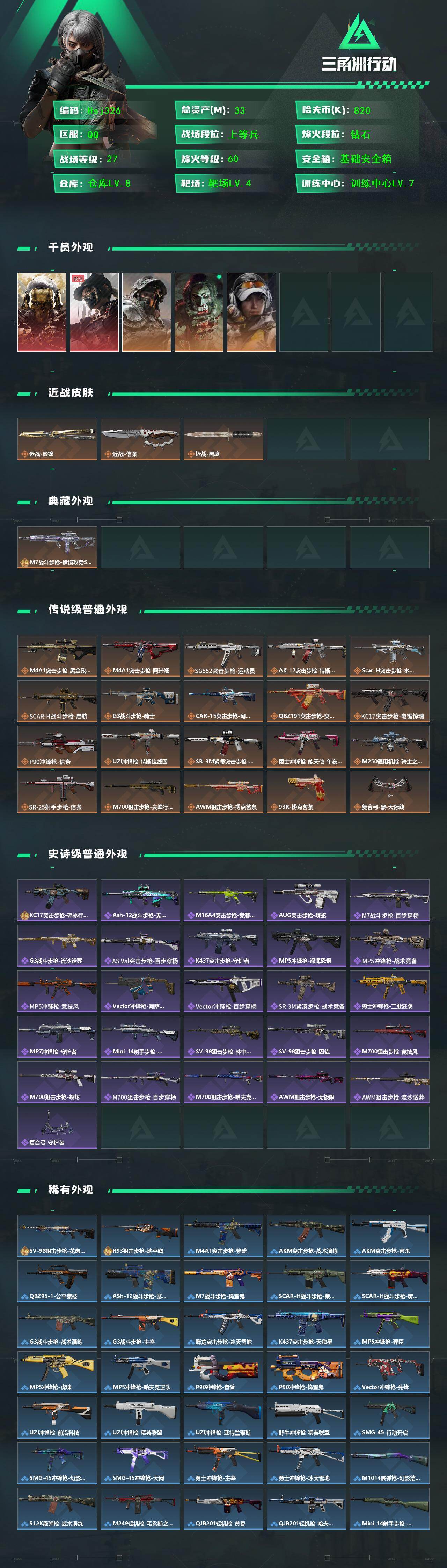 【特价秒杀】三角洲王者v8连体号【总资产33M流动资产11.5M哈夫币82w】可二次--全面战场等级:27/烽火地带等级:60【M7棱镜攻势S2(优品S)白紫、影锋、信条、红狼-蚀金玫瑰、露娜-黑·天际线】训练中心满级