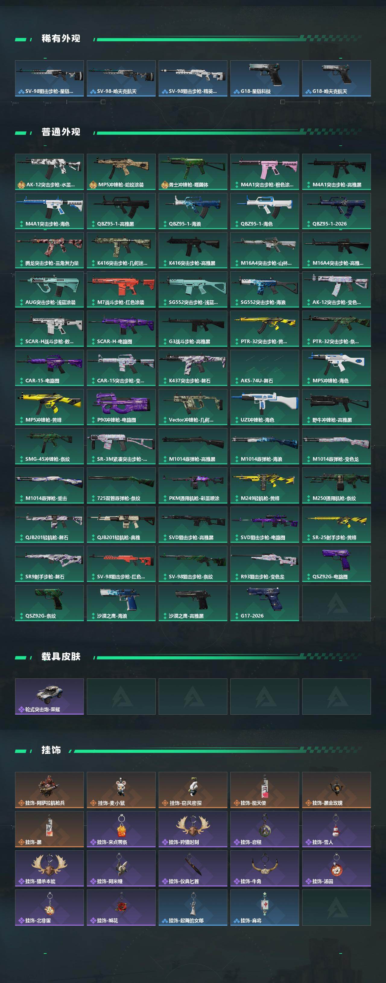 【传说外观】:M4A1突击步枪-蚀金玫瑰,M4A1突击步枪-阿米娅,M16A4突击步枪-狩猎时刻,SG552突击步枪-运动员,SCAR-H战斗步枪-启航,G3战斗步枪-狩猎时刻,腾龙突击步枪-捞点薯条,KC17突击步枪-电锯惊魂,Vect